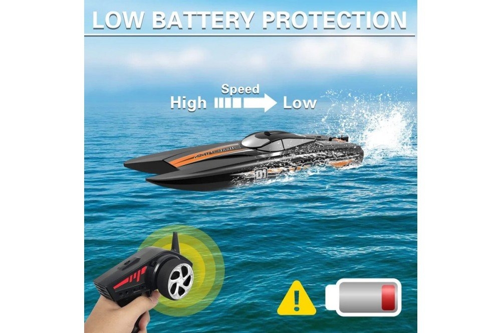Радиоуправляемое расстояние 2,4 ГГц составляет более 656 футов, а стойкость к помехам позволяет одновременно участвовать в гонках на нескольких лодках.