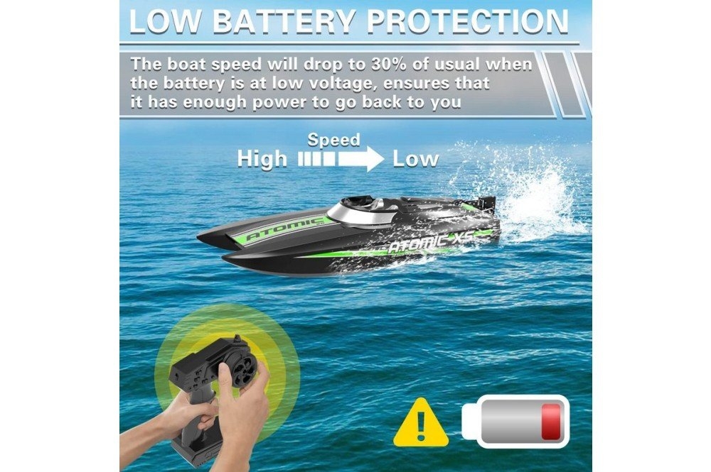 Катер оборудован аккумулятором 7,4V 380mAh. После полной зарядки катер может использоваться непрерывно до 20 минут. Когда заряд батареи упадет до низкого напряжения, она замедлится, вам не нужно беспокоиться о том, что вам придется плыть, чтобы вернуть лодку.