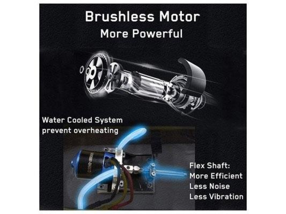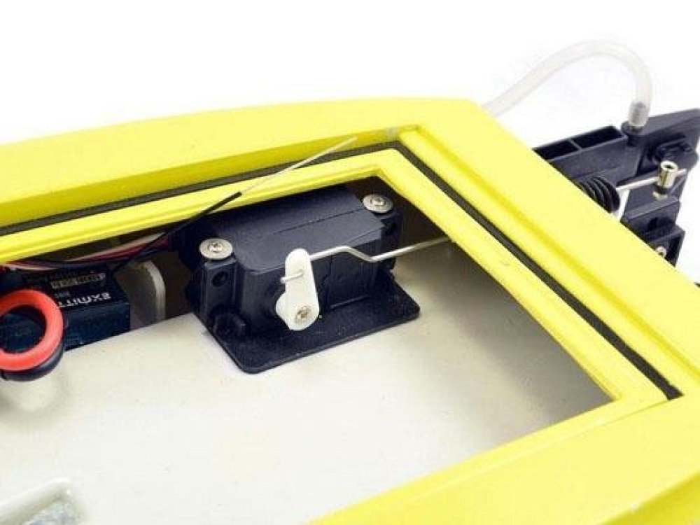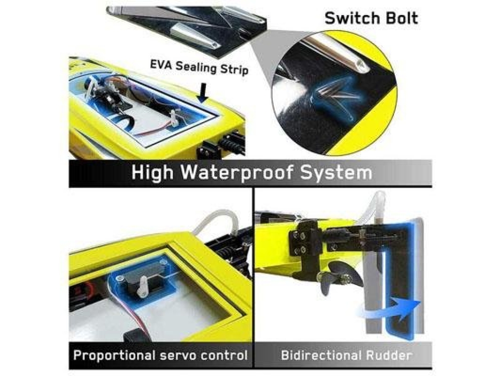Большой катер на радиоуправлении с мощной бесколлекторной системой способен за пару секунд развить скорость до 55 км/ч. Длина корпуса 70 см, центральный вал гибкий, что увеличивает эффективность и снижает уровень шума. Корпус катамаран увеличивает устойчивость на высокой скорости и на волнах во время движения. В данном катере все элементы выполнены на профессиональном уровне с точной стыковкой деталей и настройкой. Крышка корпуса плотно стыкуется к кузову, между ними находится резиновая прокладка, которая не допустит попадания воды внутрь катера.