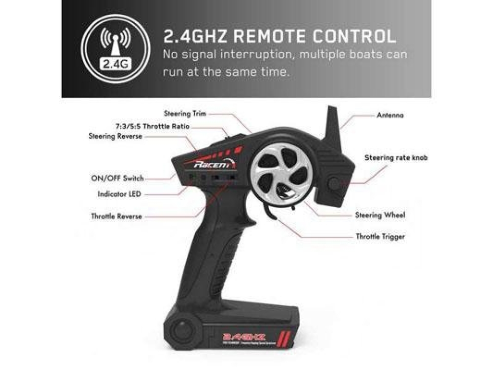 Функция автопереворота поможет вернуть катер в исходное положение, если во время заезда он все таки опрокинулся. Защита от низкого напряжения будет замедлять катер при низком заряде батареи, чтобы вы смогли немедленно вернуть его обратно. Модель имеет отличное соотношение цена/качество и комплектуется всем необходимым для заплывов.