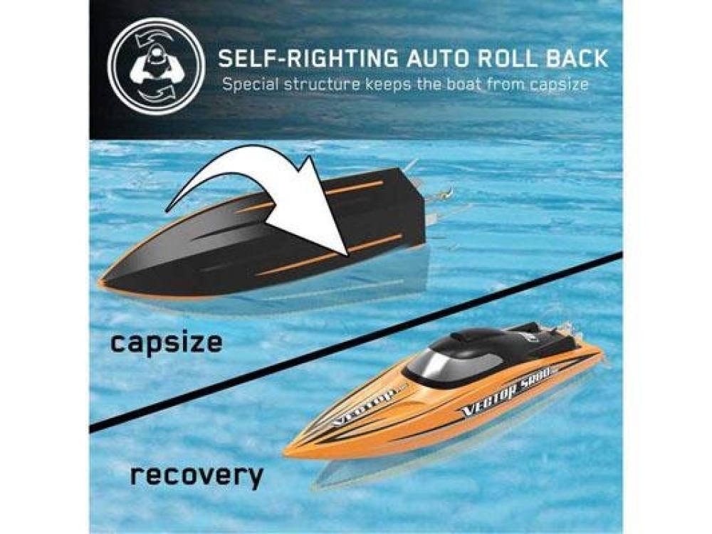 Водяное охлаждение эффективно справляется с отводом тепла от мотора и регулятора оборотов. Функция автопереворота поможет вернуть катер в исходное положение, если во время заезда он все таки опрокинулся. При низком заряде аккумулятора вы получите звуковое оповещение, чтобы успеть вернуть катер на берег.