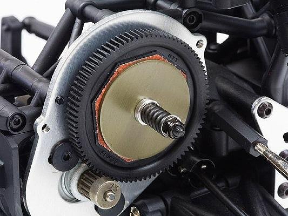 Отдельно отметим настраиваемый слиппер (проскальзывающее сцепление). При жёстком слиппере модель встанет на задние колёса при резком старте, и это способствует более быстрому износу трансмиссии. Мягкий слиппер поможет вам сохранить все шестерни и приводные валы от повышенного износа. Слиппер, спур и пиньён закрыты полупрозрачным кожухом, который защитит от попадания камней, грязи и прочего мусора. Таким образом, это увеличит срок службы шестерен и предохранит их от повреждений.
