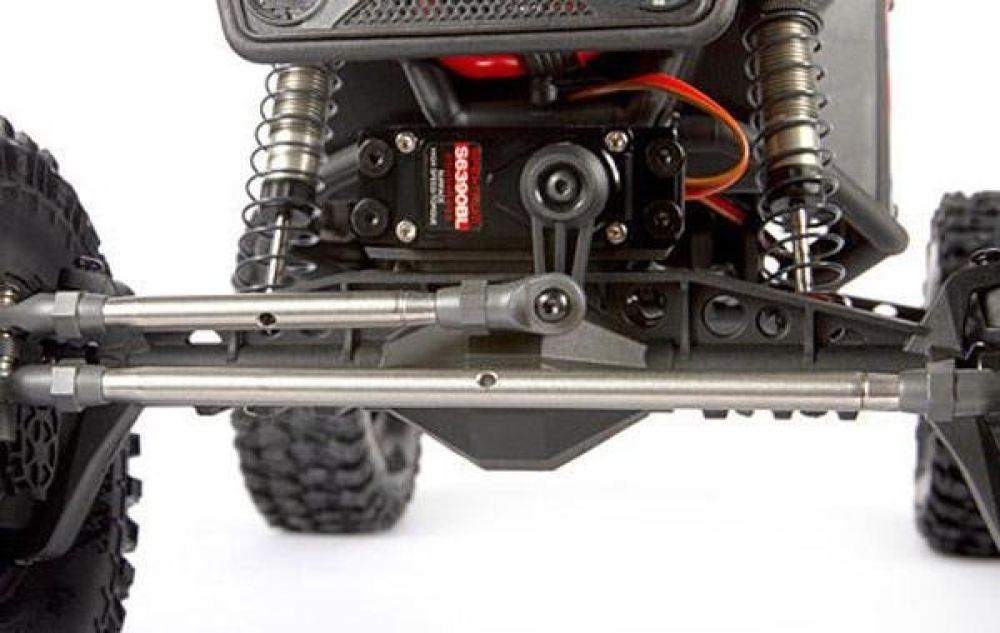 Данная багги от компании Axial максимально приближена к настоящему автомобилю по части ходовой и кузова. Длинноходная подвеска многорычажная с пружинными амортизаторами и приводными валами, обеспечивающие полный привод через 2 стальных редуктора. Задний мост можно заблокировать дистанционно для повышения проходимости.