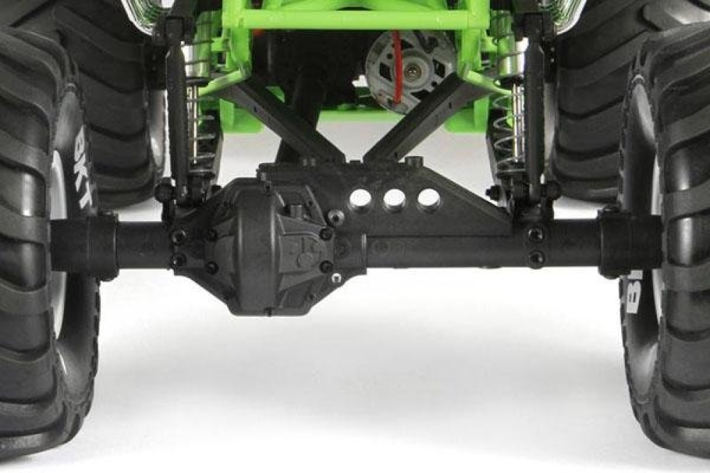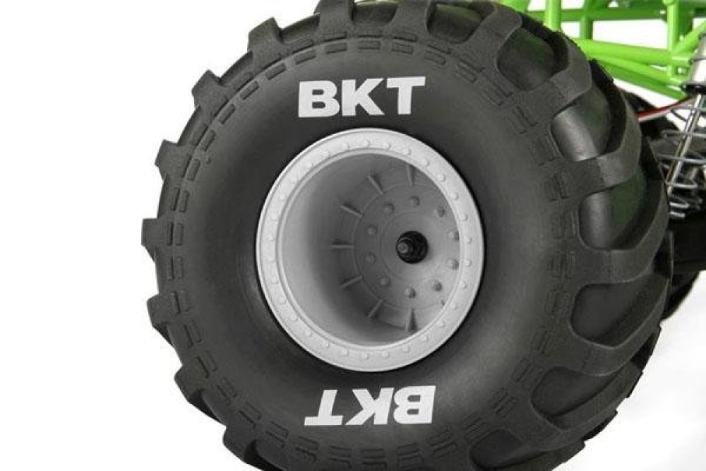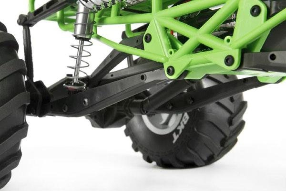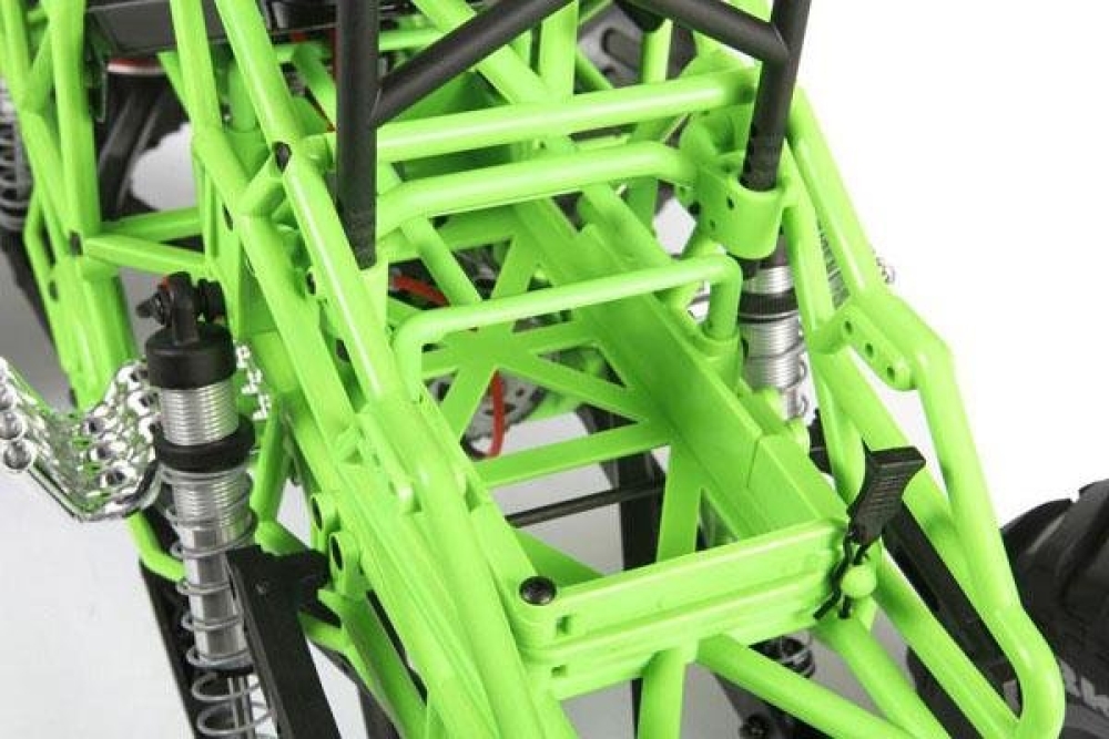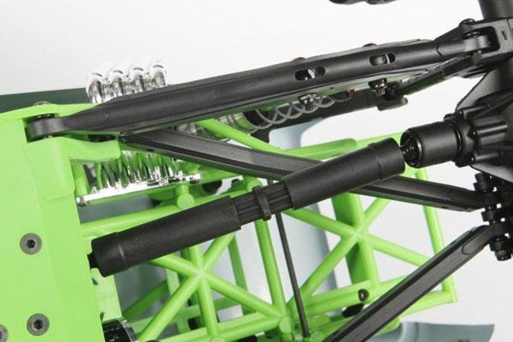 Реалистичный монстр трак с крепкой подвеской. На каждое колесо установлен мощный алюминиевый амортизатор с пружиной. Подвеска имеет длинный ход, поэтому машинку можно использовать в т.ч. и как краулер. Кузов выполнен из плотных трубок, образуя крепкий каркас. Силовая установка - коллекторный мотор 550 класса с системой редукторов и полным приводом карданного типа.