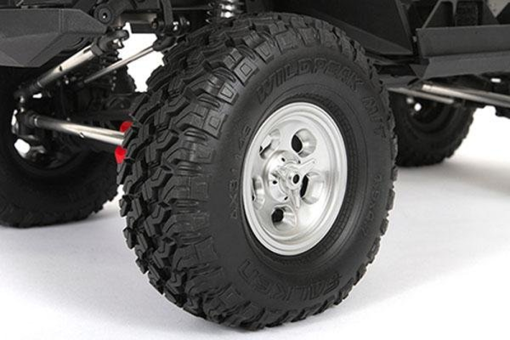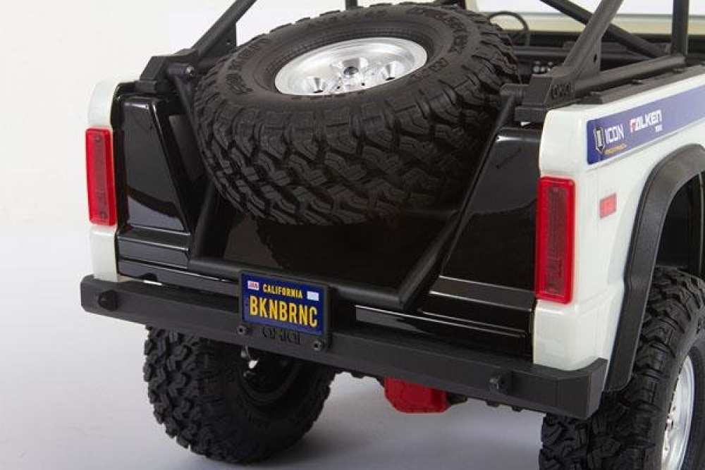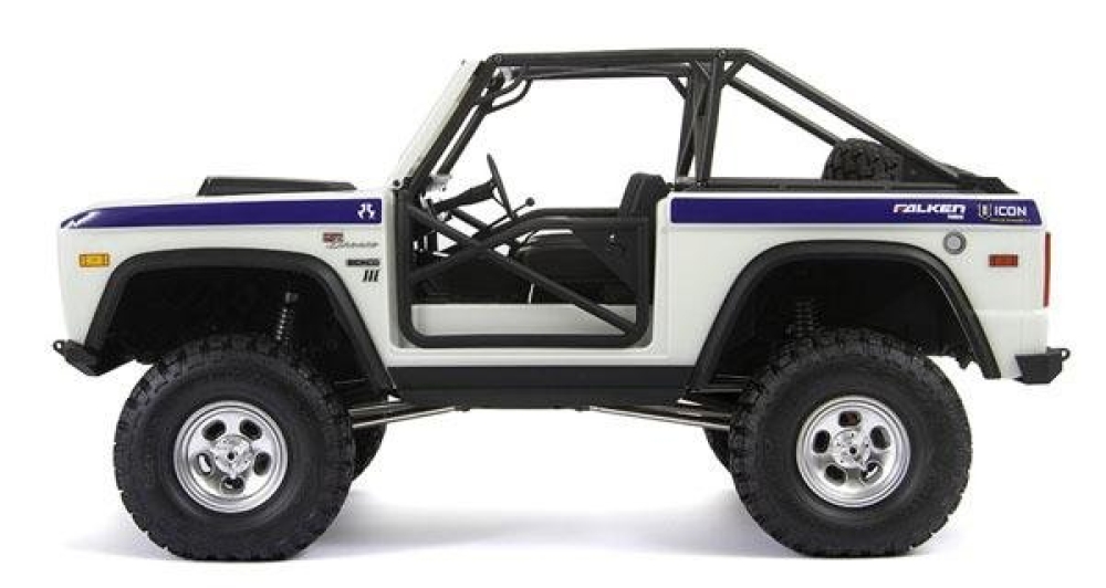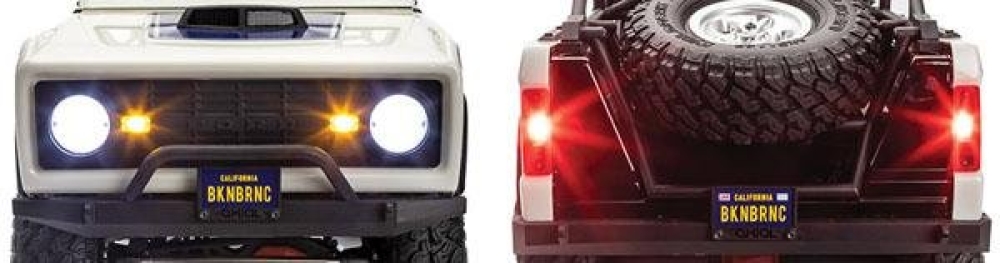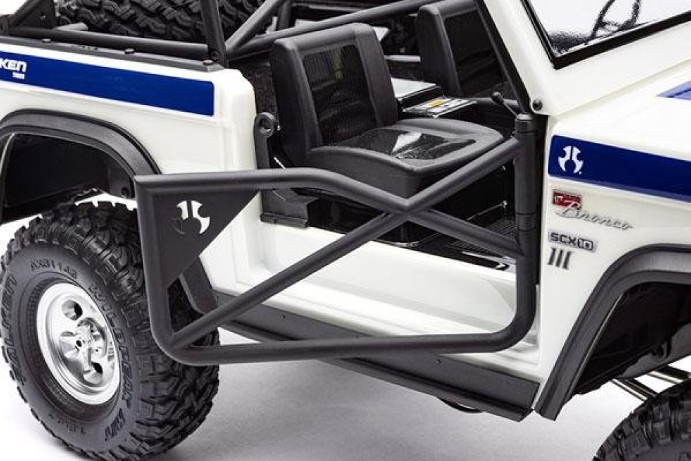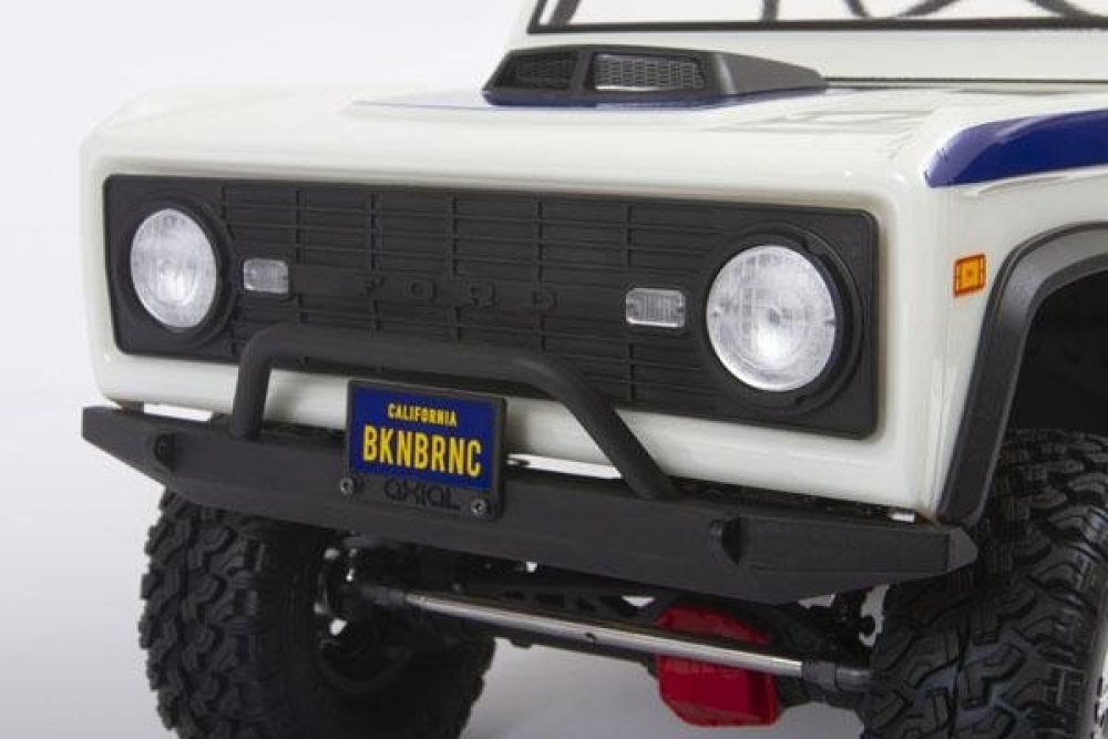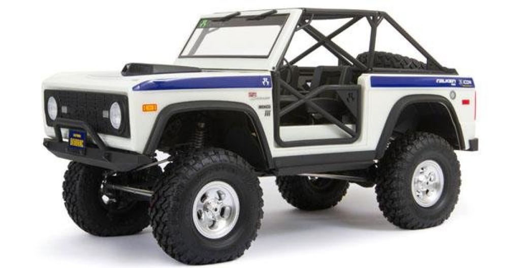 Модель автомобиля с лицензированным кузовом - Ford Bronco, построенное на популярном шасси SCX10. Оно хорошо себя зарекомендовало как очень надежное и простое в обслуживании. Оно имеет высокие арки и пороги, как в оригинале, а двери кузова машины открываются. Внутри кабины находятся руль, сиденья и другие органы управления. Также стоит отметить имитацию 5 литрового оригинального мотора и трансмиссии. В первую очередь эта модель - трофи краулер, предназначенная для полного бездорожья. Прочная подвеска и длинноходные амортизаторы помогут вам в прохождении самых серьезных препятствий. Вся электроника имеет надежную влагозащиту для полного погружения под воду.