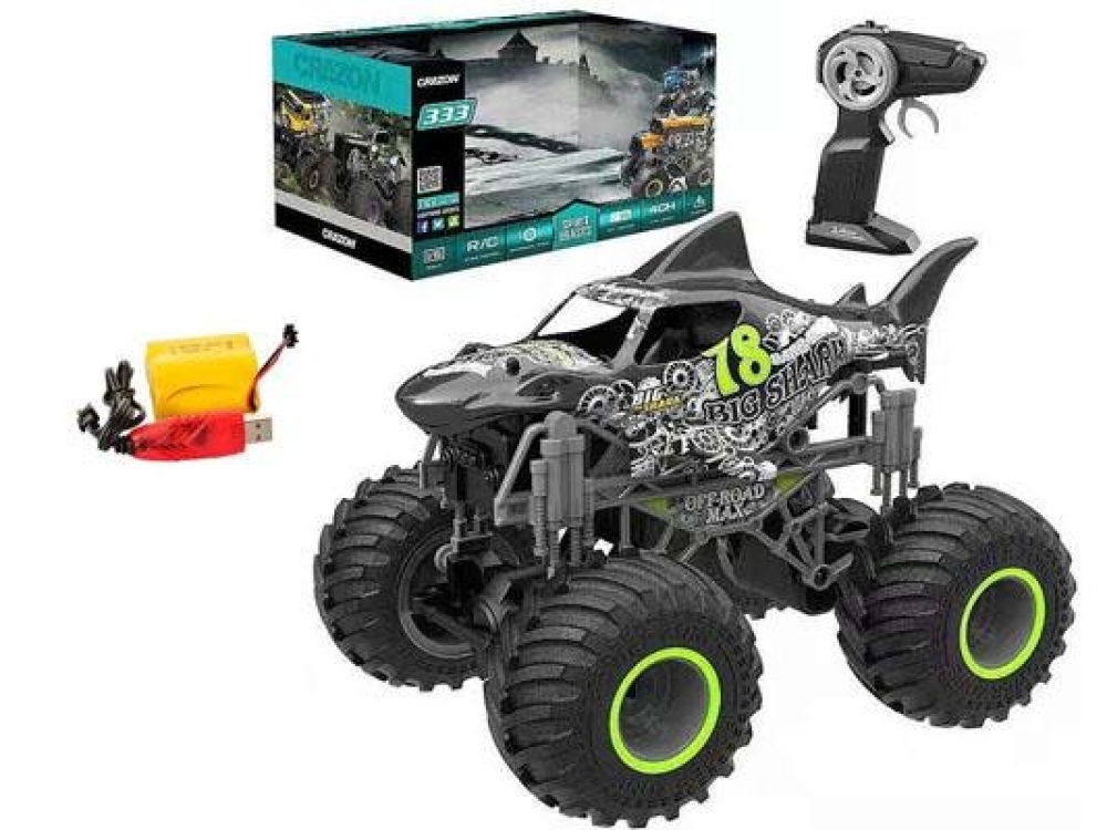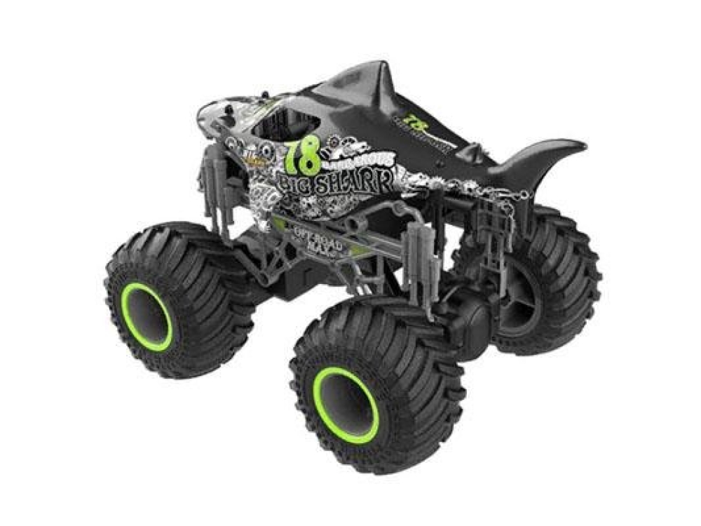 Простая в управлении игрушка на радиоуправлении. Подойдет для детей и новичков в радиомоделировании. Шасси выполнено по типу настоящих монстр траков - высокий клиренс, большие резиновые колеса и мягкая подвеска. Дизайн кузова выполнен в виде яркой акулы, а элементы шасси изготовлены с имитацией пружин и различных шестеренок. Скорость может составить до 15 км/ч, поэтому вы с легкостью сможете прыгать с трамплинов.