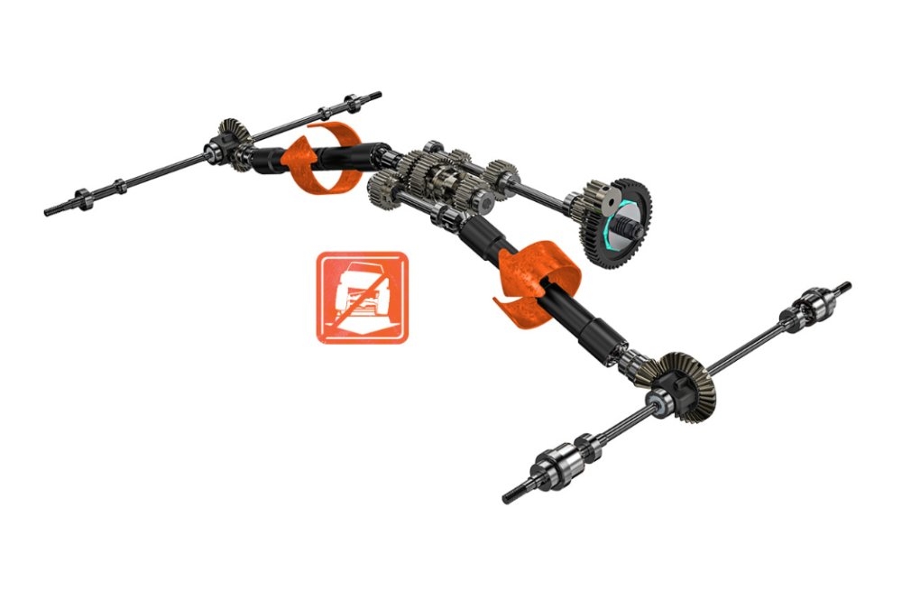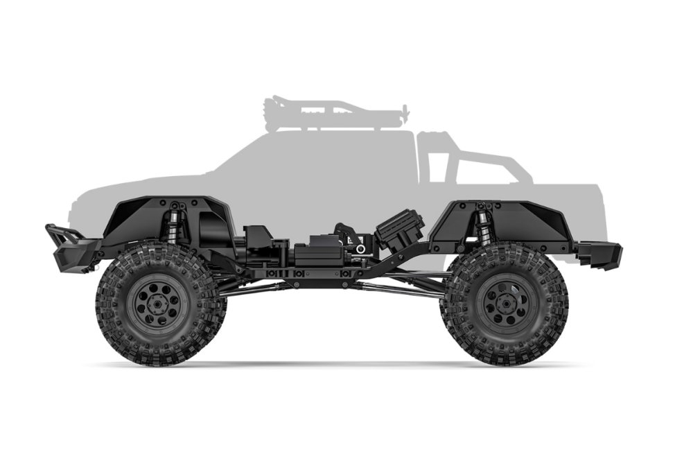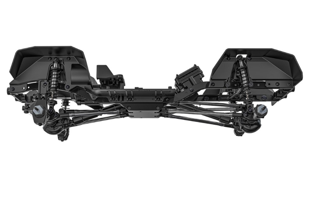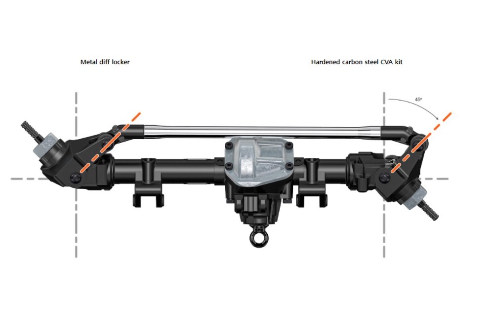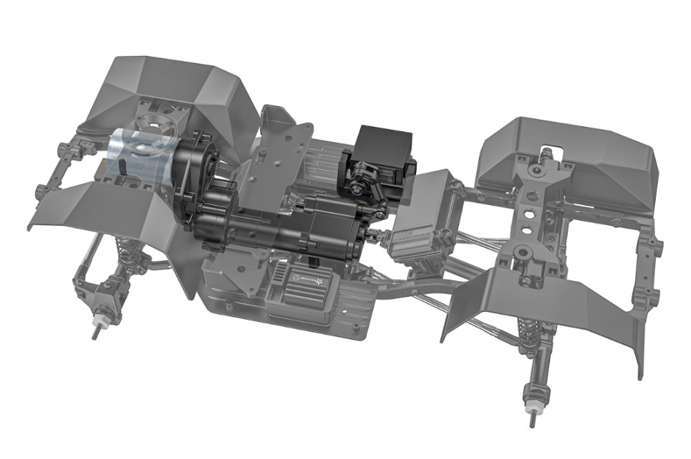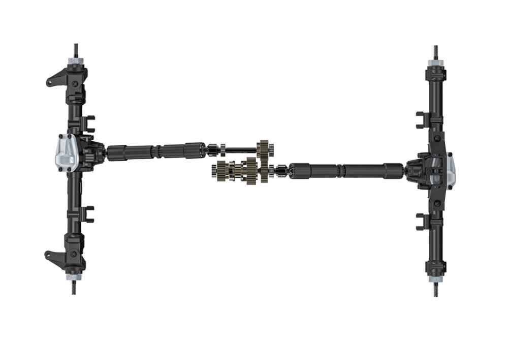 Автомобили с перегрузкой на передней оси имеют улучшенный радиус поворота по сравнению с автомобилями без перегрузки, что облегчает управление при движении по неровной поверхности. Он также оснащен 2-ступенчатой передачей, причем 1-я передача предназначена для хардкорного скалолазания, а 2-я - для подъема на холм или скоростной езды. Трансмиссия GS02F сконструирована со встречно вращающимися валами для компенсации вращательных усилий, обусловленных крутящим моментом, что повышает устойчивость грузовика. Оси GA44 спроектированы с учетом хардкорного рок-краулера. Изготовленные из высокопрочных материалов, они будут выглядеть и работать как настоящий автомобиль 1: 1.