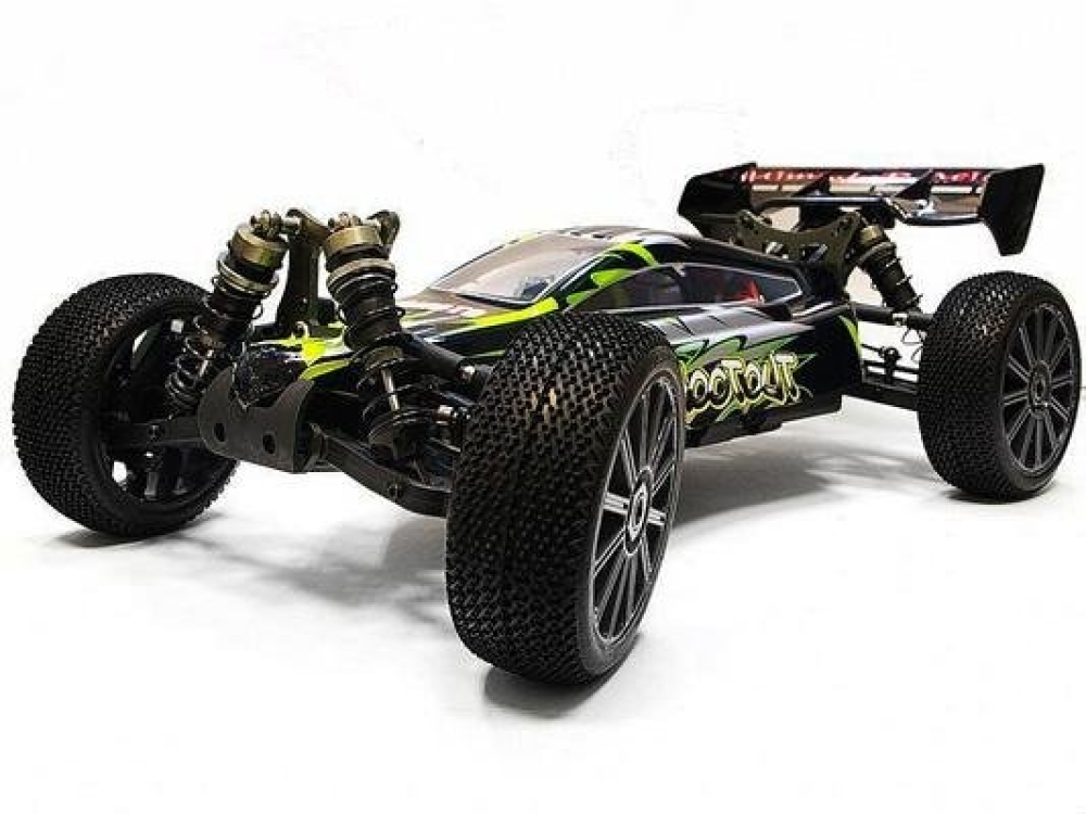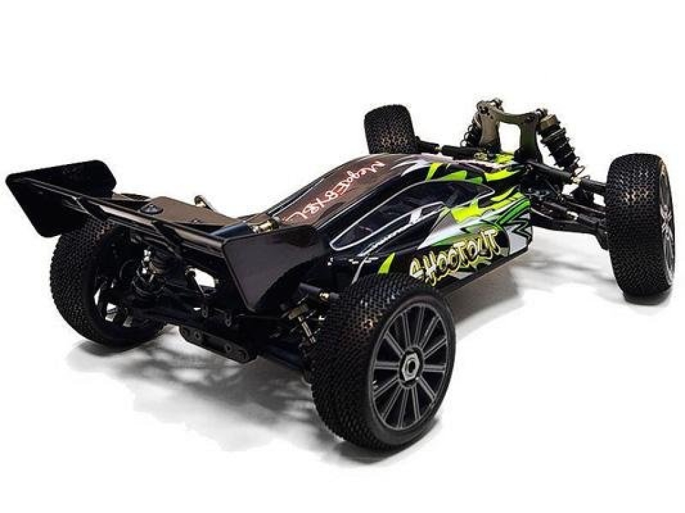 Мощная багги на бесколлекторной системе, способная развивать скорость до 80 км/ч. Цвет - яркий зеленый, машина приземистая, с агрессивным дизайном. На пульте управления есть регулировка скорости, так что можно гонять не на максимальных оборотах. Модель может разворачиваться почти на месте. Подойдет для умеренного бездорожья - гравийные трассы, песчаные дорожки, травяное покрытие. Подвеска тут достаточно жесткая, что придает спортивный характер и возможность заходить в повороты на высокой скорости.
