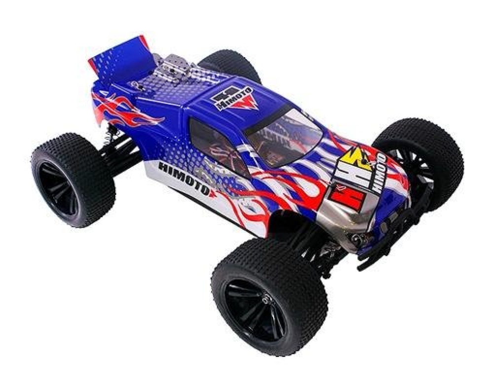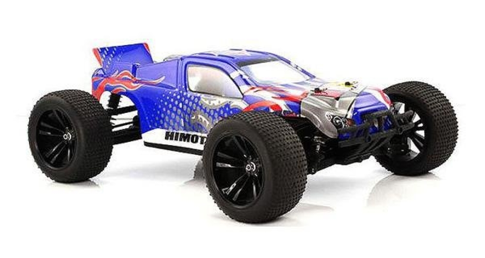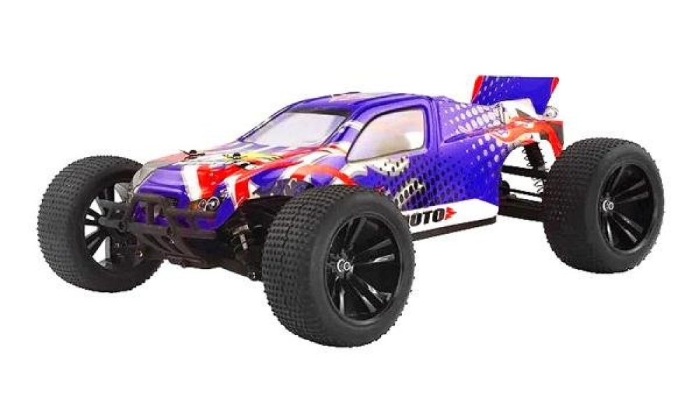 Трагги с коллекторной системой и ярким сине-белым кузовом. На корпус нанесены цветные и черно-белые элементы. Влагозащищенный регулятор оборотов обеспечивает надежную и бесперебойную работу двигателя. Постоянный полный привод работает через систему дифференциалов с улучшенным качеством. Одно из основных преимуществ модели это простая и надежная конструкция. Её легко ремонтировать, детали подвески спереди и сзади взаимозаменяемые, а приводы металлические. Пятиспицевые колеса обуты в специальные грунтовые покрышки с шипами. Машинка устойчиво ведет себя на большой скорости, даже если на пути попадаются камни или ухабы.