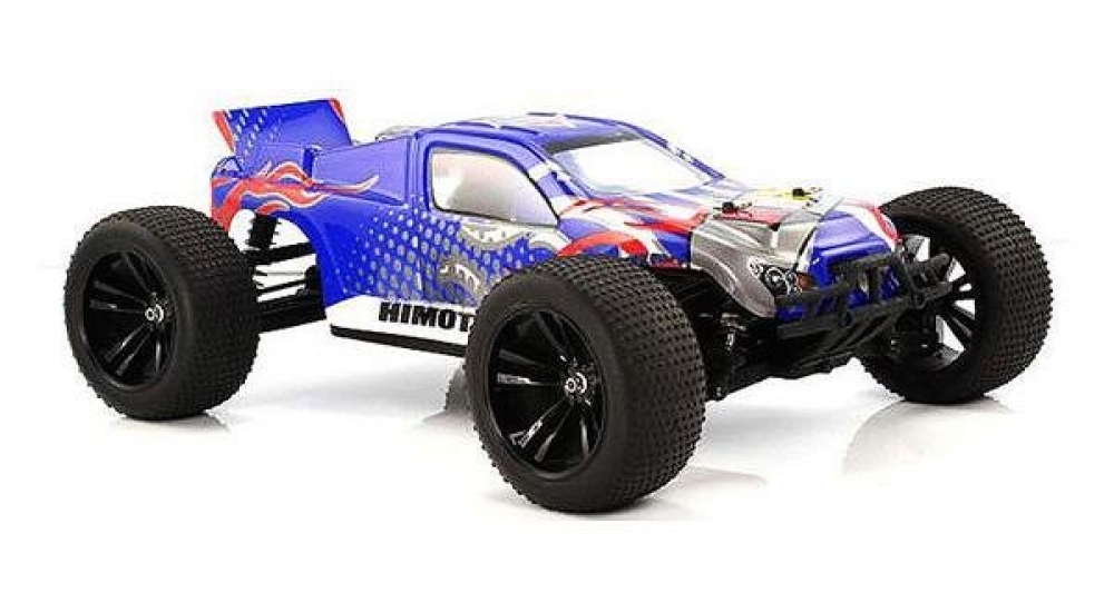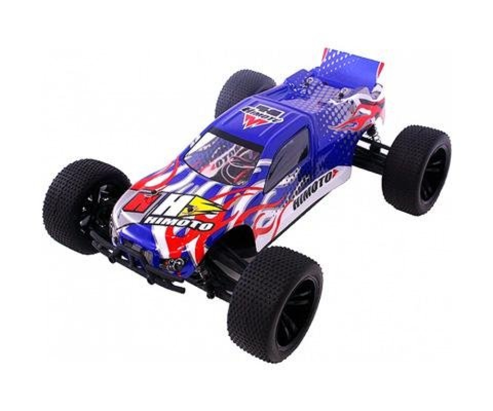 Популярная трагги с бесколлекторной системой и сине-белым кузовом с красными элементами. Влагозащищенный регулятор оборотов обеспечивает надежную и бесперебойную работу мощного двигателя. Постоянный полный привод работает через систему дифференциалов. Одно из основных преимуществ модели - это простая и надежная конструкция. Ее легко ремонтировать, детали подвески спереди и сзади взаимозаменяемые, а приводы металлические. Пятиспицевые колеса обуты в специальные грунтовые покрышки с шипами. Подвеска очень мягкая, благодаря этому машинка устойчиво ведет себя на большой скорости, даже если на пути попадаются камни или ухабы. Вес машины менее 2 кг, колеса большие, клиренс высокий. В сочетании все эти особенности делают данную модель крайне подходящей для прыжков и гоночных маршрутов.