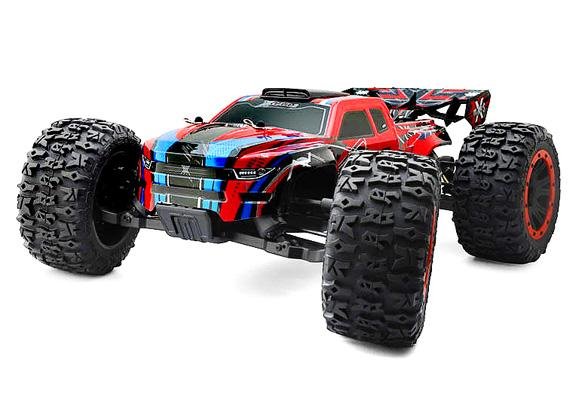 Радиоуправляемый монстр в масштабе 1:8. Легкое обслуживание, отличная проходимость, скорость - до 90 км/ч. Двигатель - бесколлекторный 4074/2200Kv. Корпус выполнен в красном цвете с синими вставками.