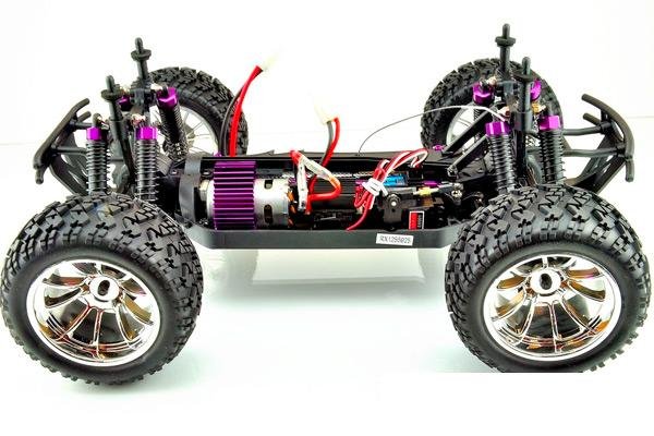 Монстр способен разгоняться до скорости в 45 км/ч. При этом за стабильность движения отвечают двойные масляные амортизаторы, расположенные на каждом колесе. Управлять внедорожником очень просто, удобный пульт управления не требует дополнительных навыков. Радиус его действия достигает 150-200 м - для самых захватывающих гонок. Конструкция позволяет модернизировать кузов и ходовые части машинки для улучшения ее характеристик.
