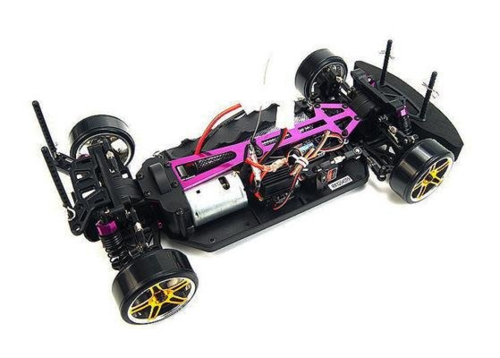 Шасси прочное, усилено алюминиевой декой. Полный привод помогает контролировать машину в заносах, устойчивость и управляемость машинки обеспечивают жесткие короткоходные амортизаторы и пружины переменного шага. Центр тяжести модели перенесен на оси колес за счет низкого клиренса и специальной конструкции ходовой части. Подвеска настраиваемая, позволяет регулировать сход-развал колес.