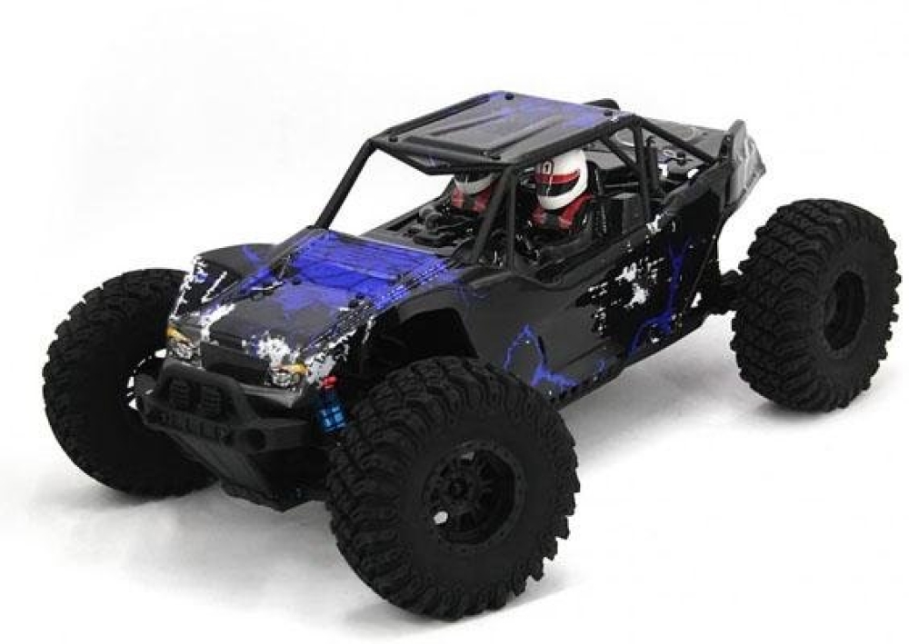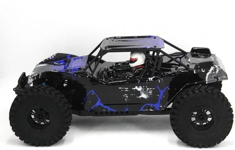 Большая багги с б/к системой для скоростных заездов по бездорожью. За счет большого шасси и колес, а также мощному мотору способен на высокой скорости преодолевать песчаные трассы, гравийные насыпи, грязевую колею и многое другое. Из металла на данной модели изготовлены - все валы и тяги, а также амортизаторы. Передняя подвеска выполнена в более классическом исполнении - нижние и верхние рычаги со стабилизаторами и пружинные маслонаполненные амортизаторы. Задняя подвеска имеет существенно больший ход, поэтому модель имеет повышенную маневренность при приземлениях после прыжков с трамплинов на большой скорости.