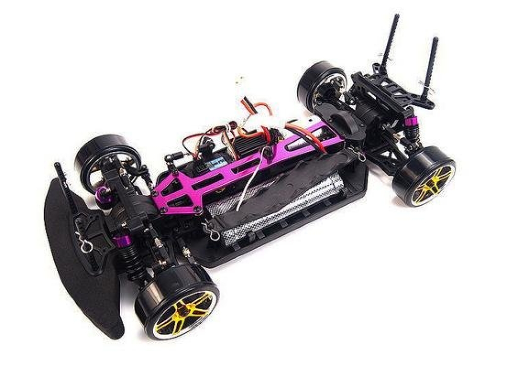 Шасси прочное, усилено алюминиевой декой. Полный привод помогает контролировать машину в заносах, устойчивость и управляемость машинки обеспечивают жесткие короткоходные амортизаторы и пружины переменного шага. Центр тяжести модели перенесен на оси колес за счет низкого клиренса и специальной конструкции ходовой части. Подвеска настраиваемая, позволяет регулировать сход-развал колес.