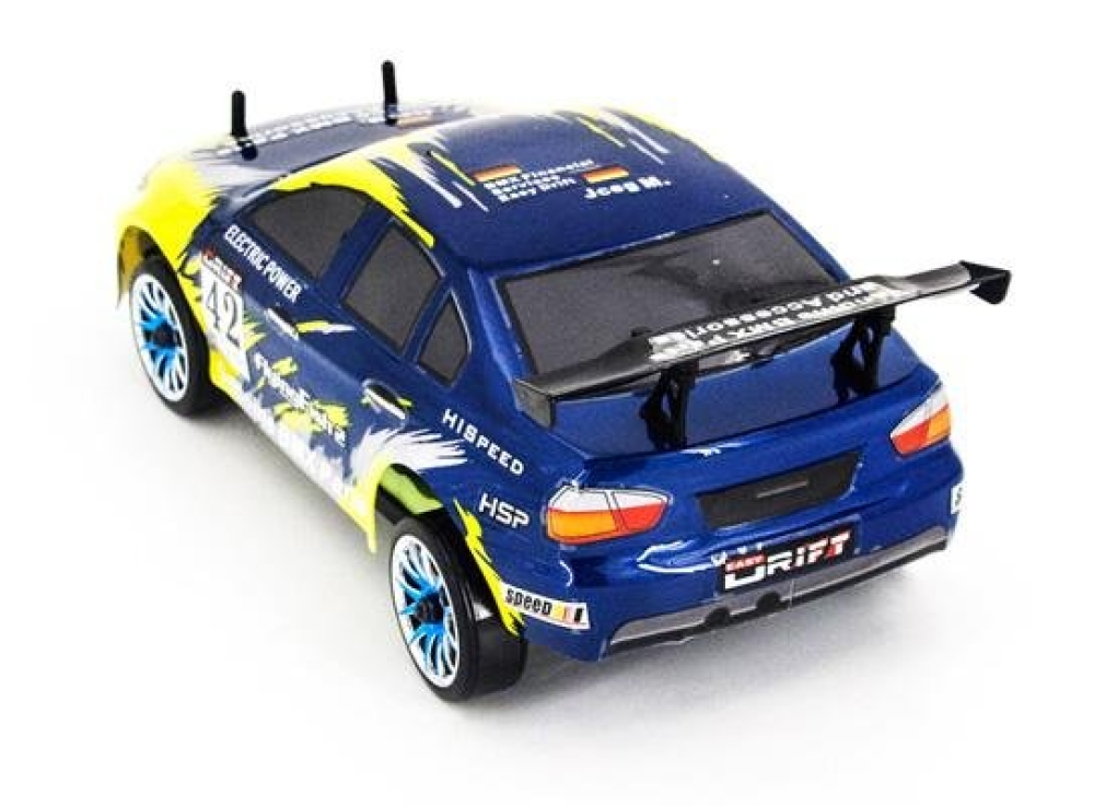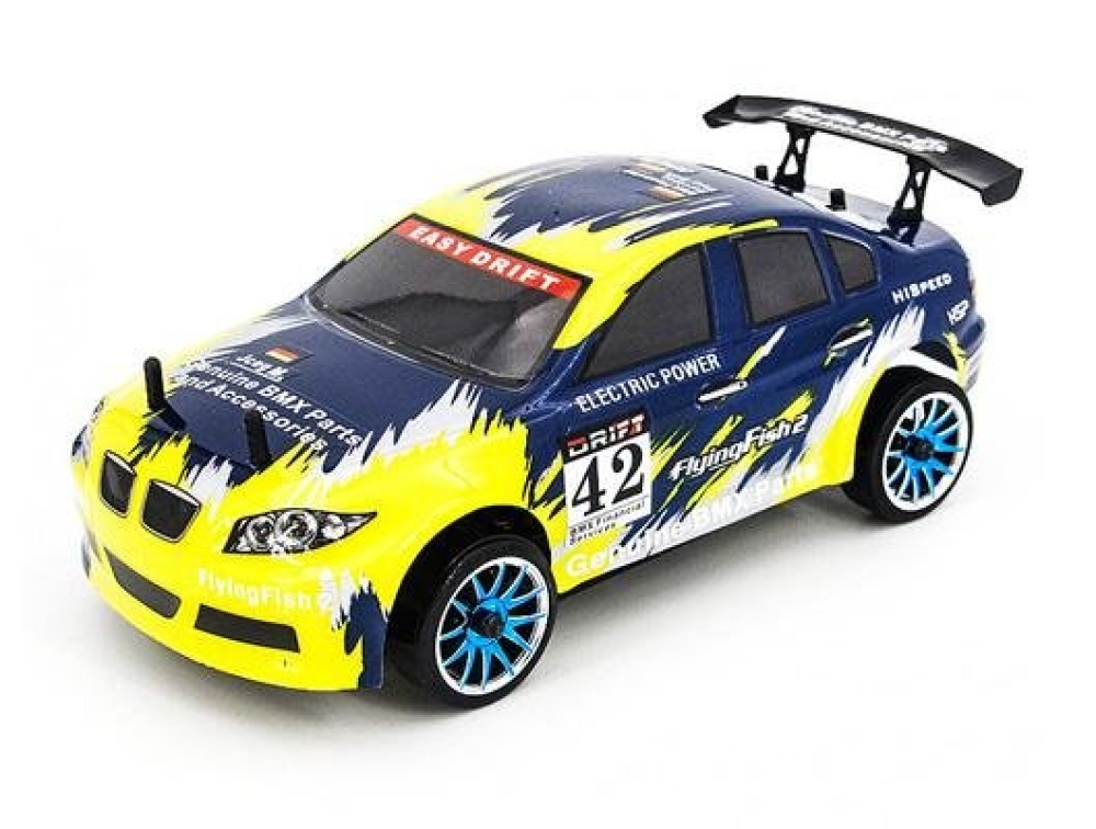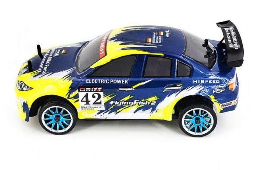 HSP Flying Fish 2 4WD RTR (94163 TOP/16303) - это машинка для дрифта на радиоуправлении масштаба 1:16, с постоянным полным приводом 4WD. Поставляется уже собранной и готовой к заездам прямо из коробки - нужно только полностью зарядить и подсоединить аккумулятор. Спортивный аэродинамичный корпус выполнен в сине-жёлтом цвете с черными и белыми декалями.