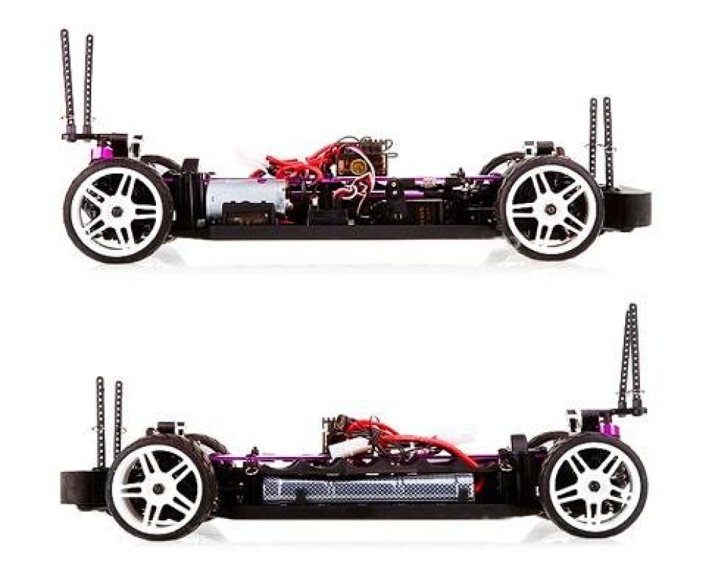 Шасси прочное, усилено алюминиевой декой. Полный привод помогает контролировать машину в заносах, устойчивость и управляемость машинки обеспечивают жесткие короткоходные амортизаторы и пружины переменного шага. Центр тяжести модели перенесен на оси колес за счет низкого клиренса и специальной конструкции ходовой части. Подвеска модели настраиваемая, позволяет точно регулировать угол развала и схождения колес для обеспечения нужных характеристик.
