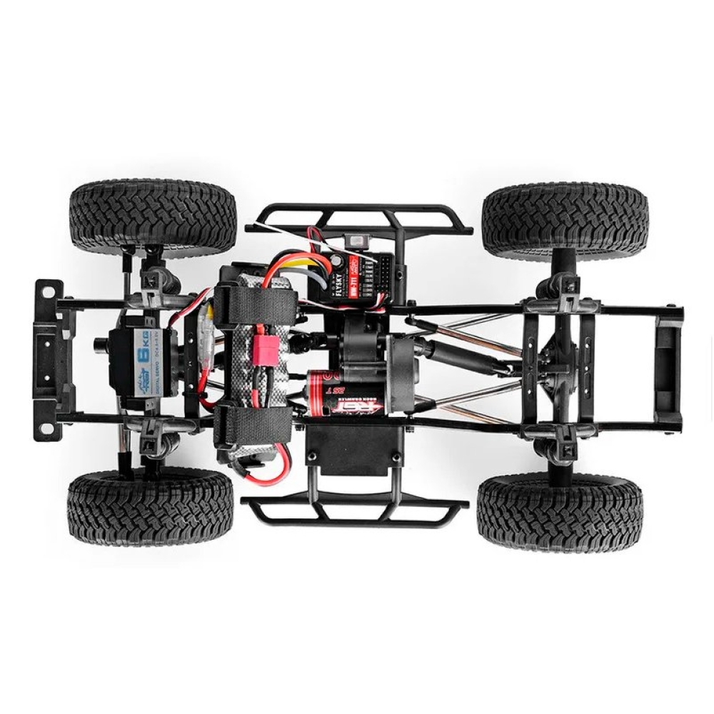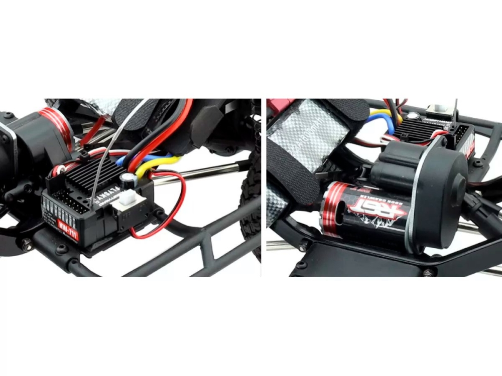На краулер устанавливается влагозащищенная сервомашинка и регулятор оборотов. Такое решение позволяет компонентам модели сохранять надежность работы при попадании отдельных капель воды и пыли.