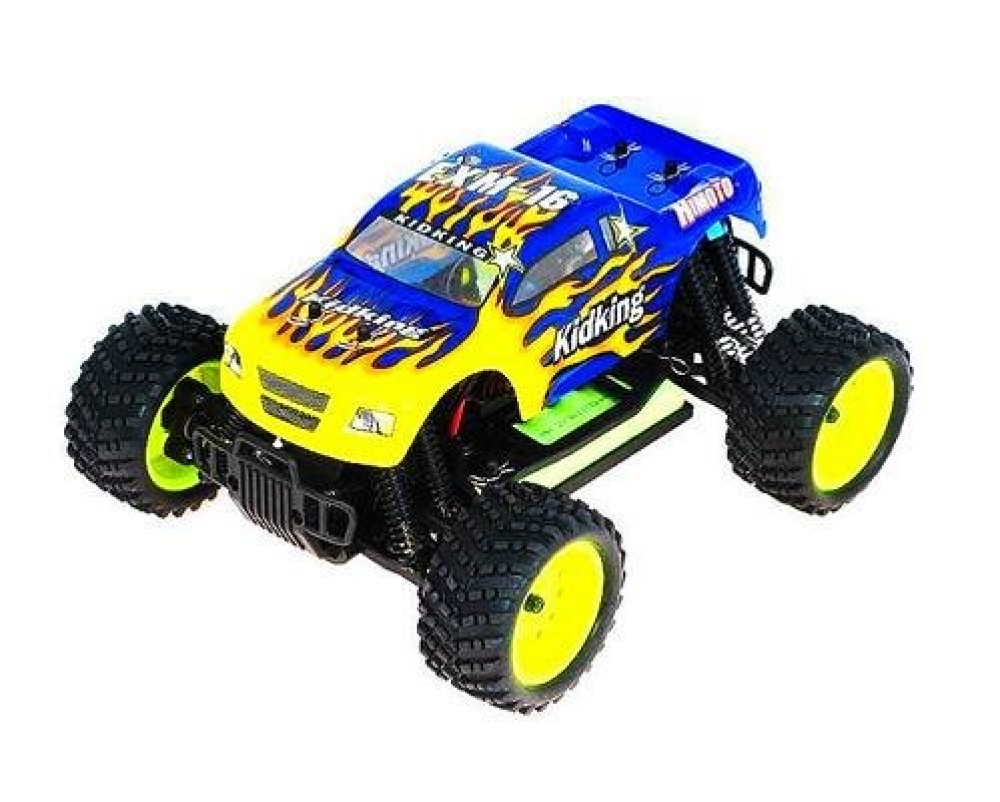Радиоуправляемый монстр HSP KidKing 4WD RTR масштаб 1:16 2.4G - 94186|18601 - это полноприводная модель монстр-трака в масштабе 1:16. Бюджетная, но при этом надежная, она прекрасно подходит не только для гонок по асфальту или прогулок по двору, но и для преодоления треков, заездов по бездорожью и для прыжков с трамплинов. Сервомашинка и регулятор оборотов влаго- и пылезащищены, поэтому брызги воды и виражи на пыльных дорогах KidKing не страшны. Спортивный корпус машины выполнен в жёлтом, оранжевом и синем цветах.