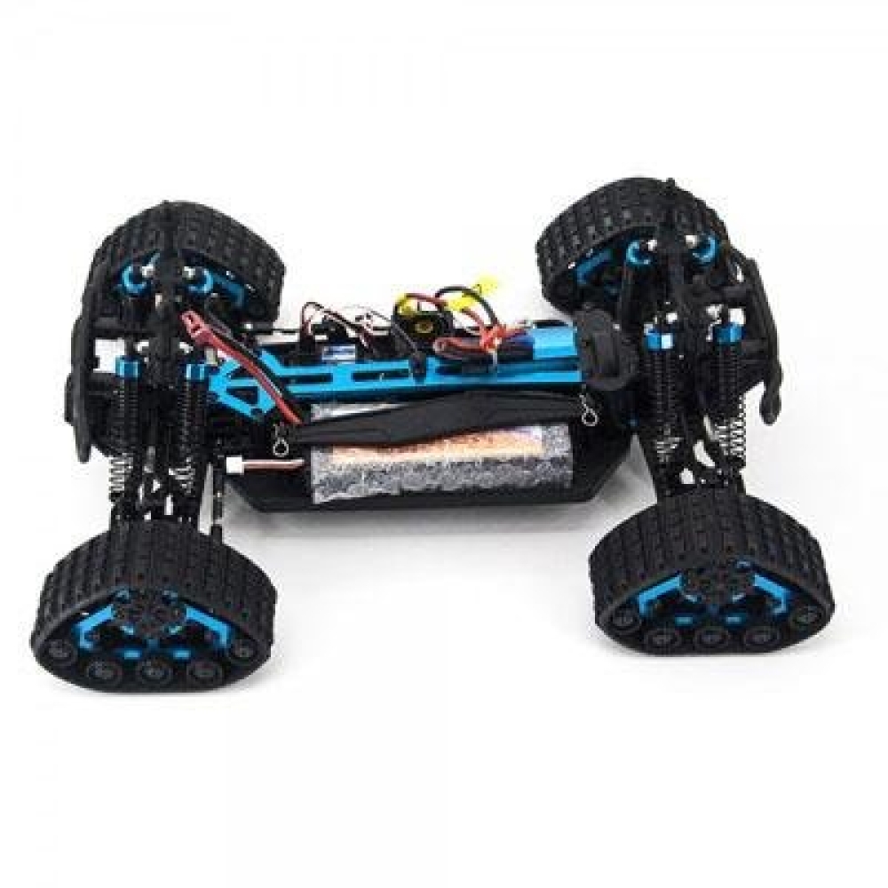 Классическое и самое популярное шасси от компании HSP превратили в сверх проходимый вездеход. Вместо колес установлены 4 гусеничных механизма, поэтому данный монстр сможет преодолеть любые дорожные трудности. Можете смело съезжать с дороги на гравий, песок, грязь, траву и снег - отсутствие дороги не помеха. В остальном это все то же, хорошо знакомое шасси. Многорычажная подвеска по 2 амортизатора на каждое колесо, регулируемые тяги. Полный привод работает через центральный вал и металлические дифференциалы. Для придания дополнительной прочности, особенно в холодную погоду, в верхней части шасси установлена 2-мм алюминиевая пластина. Монстр имеет бесколлекторный мотор, а это значит, что даже на гусеницах он способен разгоняться до 50 км/ч!
