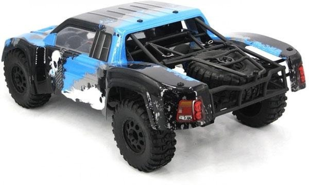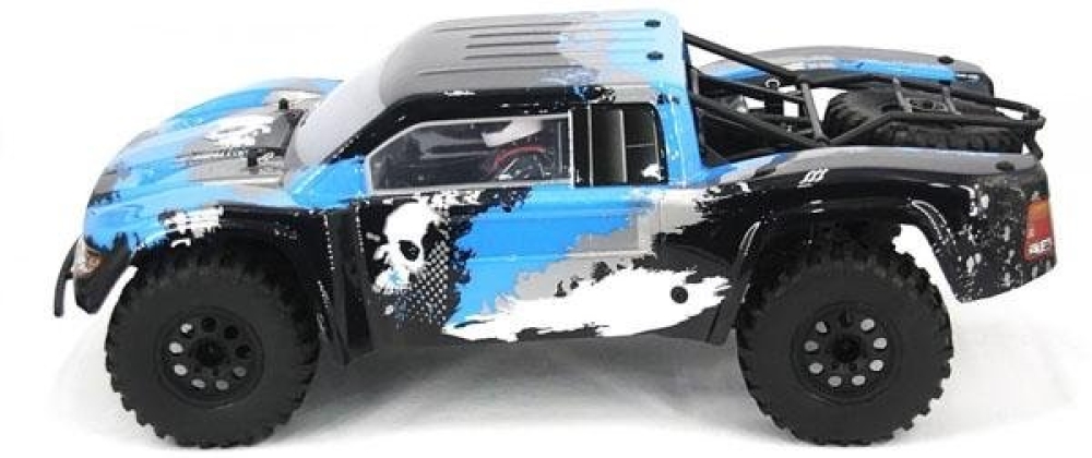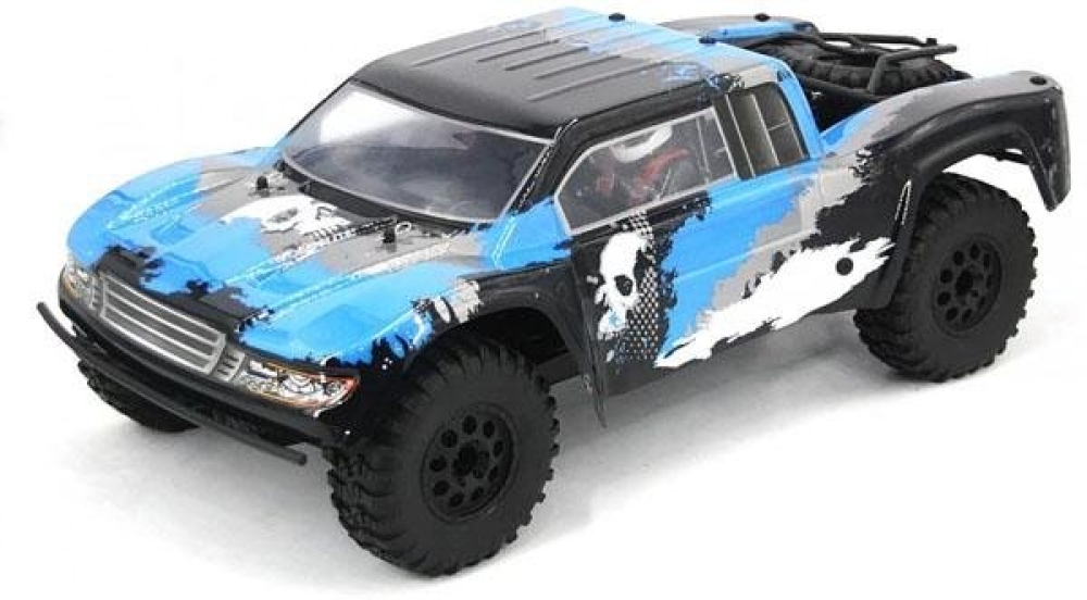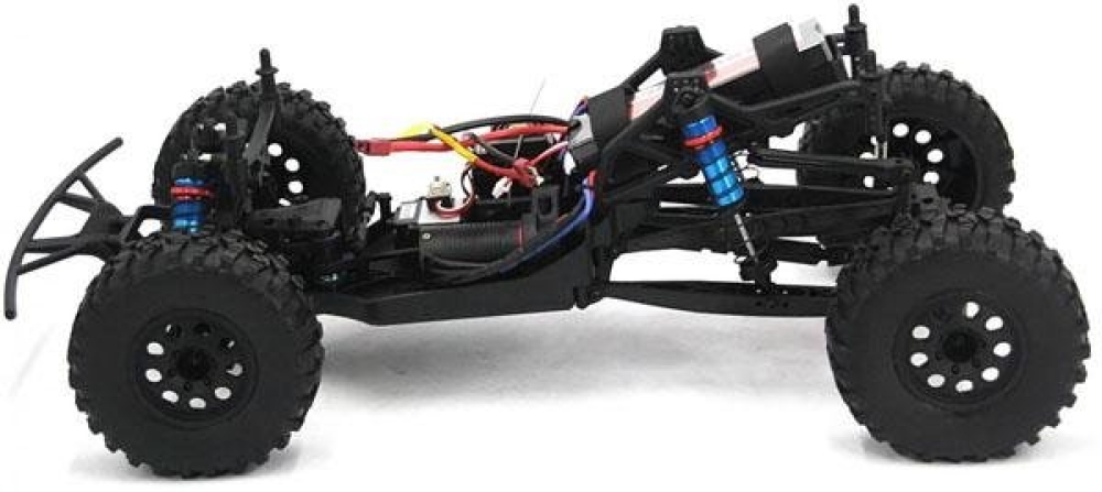 Большой шорт-корс с б/к системой для скоростных заездов по бездорожью. За счет большого шасси и колес, а также мощному мотору способен на высокой скорости преодолевать песчаные трассы, гравийные насыпи, грязевую колею и многое другое. Из металла на данной модели изготовлены - все валы и тяги, а также амортизаторы. Передняя подвеска выполнена в более классическом исполнении - нижние и верхние рычаги со стабилизаторами и пружинные маслонаполненные амортизаторы. Задняя подвеска имеет существенно больший ход, поэтому модель имеет повышенную маневренность при приземлениях после прыжков с трамплинов на большой скорости. Кузов выполнен из плотного ABS пластика с применением трубчатой рамы.
