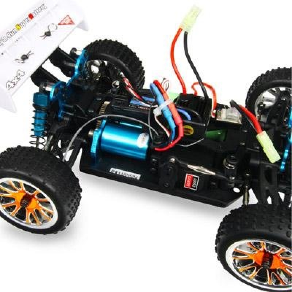Среднеразмерная багги с б/к системой - выдержит любые дорожные испытания. Большая часть элементов шасси изготовлена из металла - все что может сломаться при ударах, а именно: амортизаторы, стойки амортизаторов, рычаги и приводы колес. Моторный отсек открытого типа поможет упростить обслуживание мотора и приводных шестеренок. Если между шестеренками попал песок, то вы можете очистить систему на месте, не прибегая к разбору. Модель имеет влагозащиту электроники, поэтому заезды в дождь или снег - не проблема. Разноширокие колеса (узкие спереди и широкие сзади) позволяют уверенно стартовать и точно входить в крутые повороты.