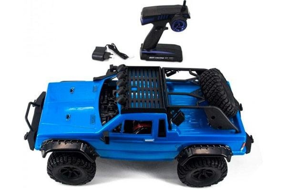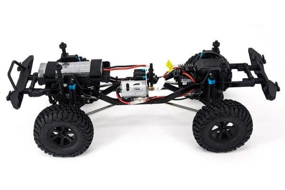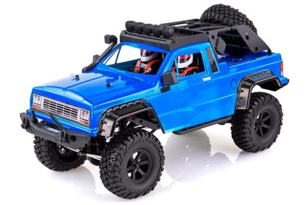 Этот радиоуправляемый краулер синего цвета полностью повторяет известный оригинальный джип пикап, который участвовал в Трофи заездах. Кузов имеет детализированные колесные арки, передний бампер, дополнительный багажник с запаской на крыше, а также 2 пилотов в салоне. Краулер имеет зависимую подвеску с маслонаполненными дифференциалами внутри, постоянный полный привод 4WD осуществляется за счёт 2 приводных валов, скорость движения регулируется за счет точно настроенного регулятора оборотов HW40A. Баланс массы подобран очень грамотно, чтобы карабкаться на разные поверхности, например мотор с коробкой передач расположен по центру, электроника управляющая автомобилем сзади, а емкий аккумулятор 2000 mah и сервомашинка находится впереди. Маслонаполненные амортизаторы расположены на каждом колесе, а сама подвеска имеет увеличенный ход для того чтобы преодолевать самое серьезное бездорожье. Чтобы чувствовать себя уверенно на любой дороге серво имеет усилие в 15 кг, передаточное число 1:37, вес почти 2,5 кг, а длина больше полуметра. Этот автомобиль понравится как любителям копийных моделей, так и радиоуправляемых игрушек, и подойдёт для детей от 6 лет .