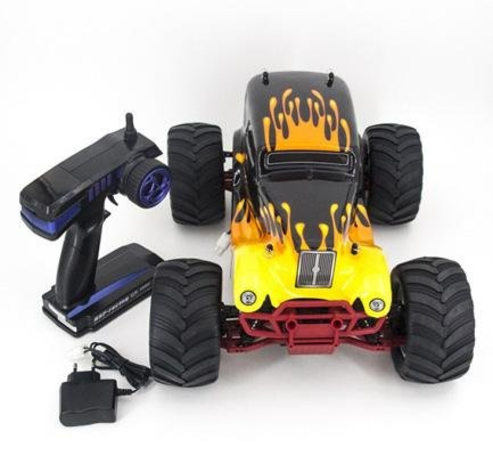 Монстр в 10 масштабе порадует вас своей прочностью и проходимостью. Вдоль всего шасси проходит металлическая пластина 2мм, которая делает машинку очень стойкой к фронтальным ударам на высокой скорости. Внедорожные колеса в стиле монстр-трак позволят проехать по любому типу поверхности. Подвеска имеет двойные амортизаторы на каждое колесо. Прыжки с трамплинов просто созданы для этой машины.