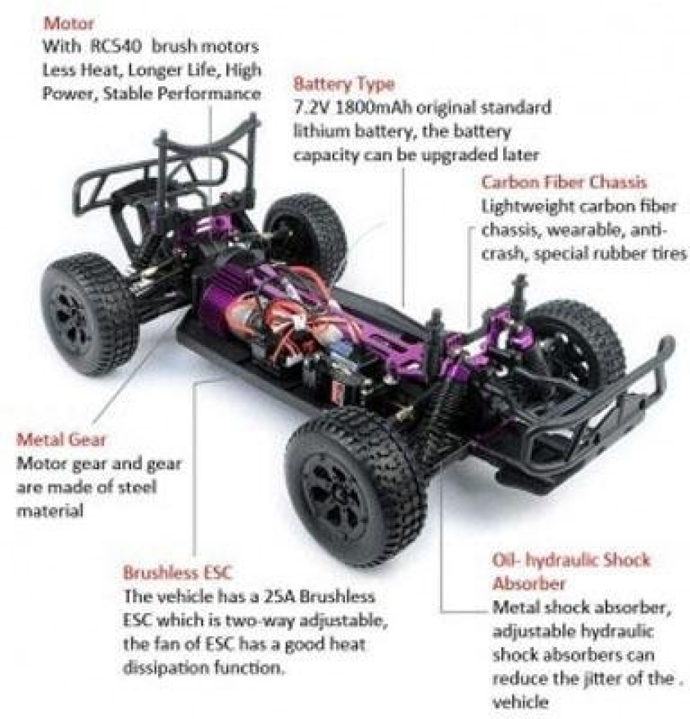 Комплект поставки: полностью собранная модель, с окрашенным кузовом и установленной влагозащищенной электроникой 2.4G, аккумулятор - 7.2v 1800mAh, зарядное устройство для аккумулятора, работающее от сети 220v., пульт управления моделью, инструкция на русском языке