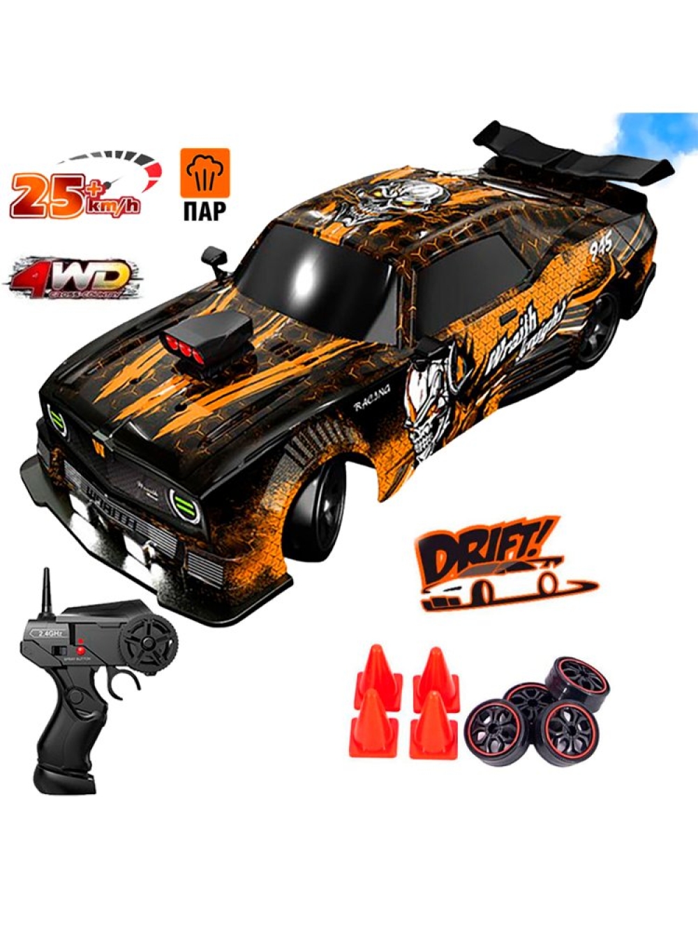 Радиоуправляемая машина Ford Mustang (4WD, свет, пар, акб, 1:16) - SC16A17 - это машинка для дрифта на радиоуправлении масштаба 1:16, с полным приводом 4WD. Поставляется уже собранной и готовой к заездам прямо из коробки - нужно только полностью зарядить и подсоединить аккумулятор. Спортивный корпус выполнен в оранжевом и чёрном цветах. Есть цветные декали.