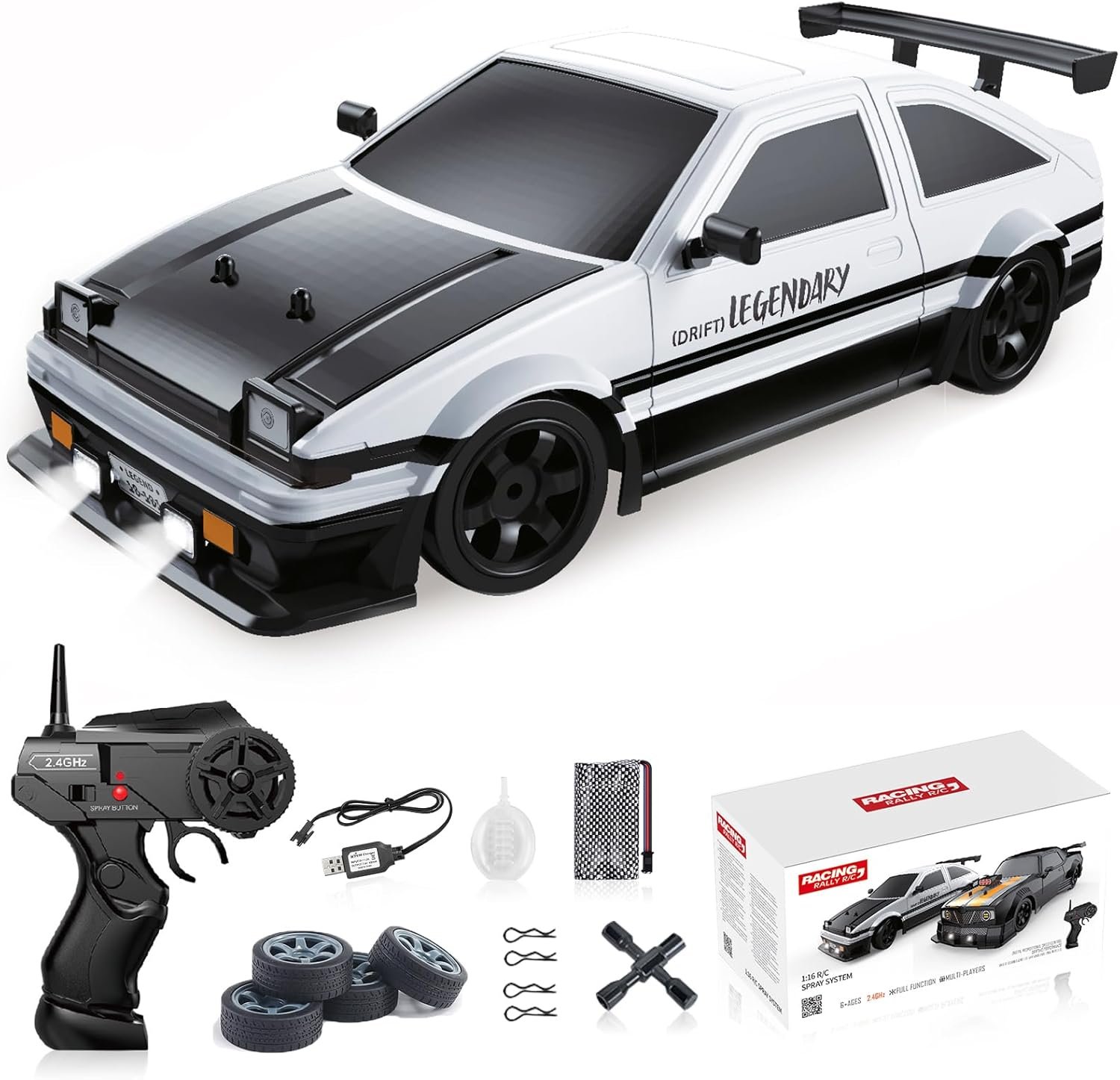 Машинка для дрифта от HB Toys масштаба 1:16. Помимо пульта ДУ в наборе поставляются запасные колеса, ключ для смены колес, зарядное устройство и аккумулятор. Из выхлопной трубы можно активировать спрей-пар, а фары светятся во время движения. Цвет кузова - белый.