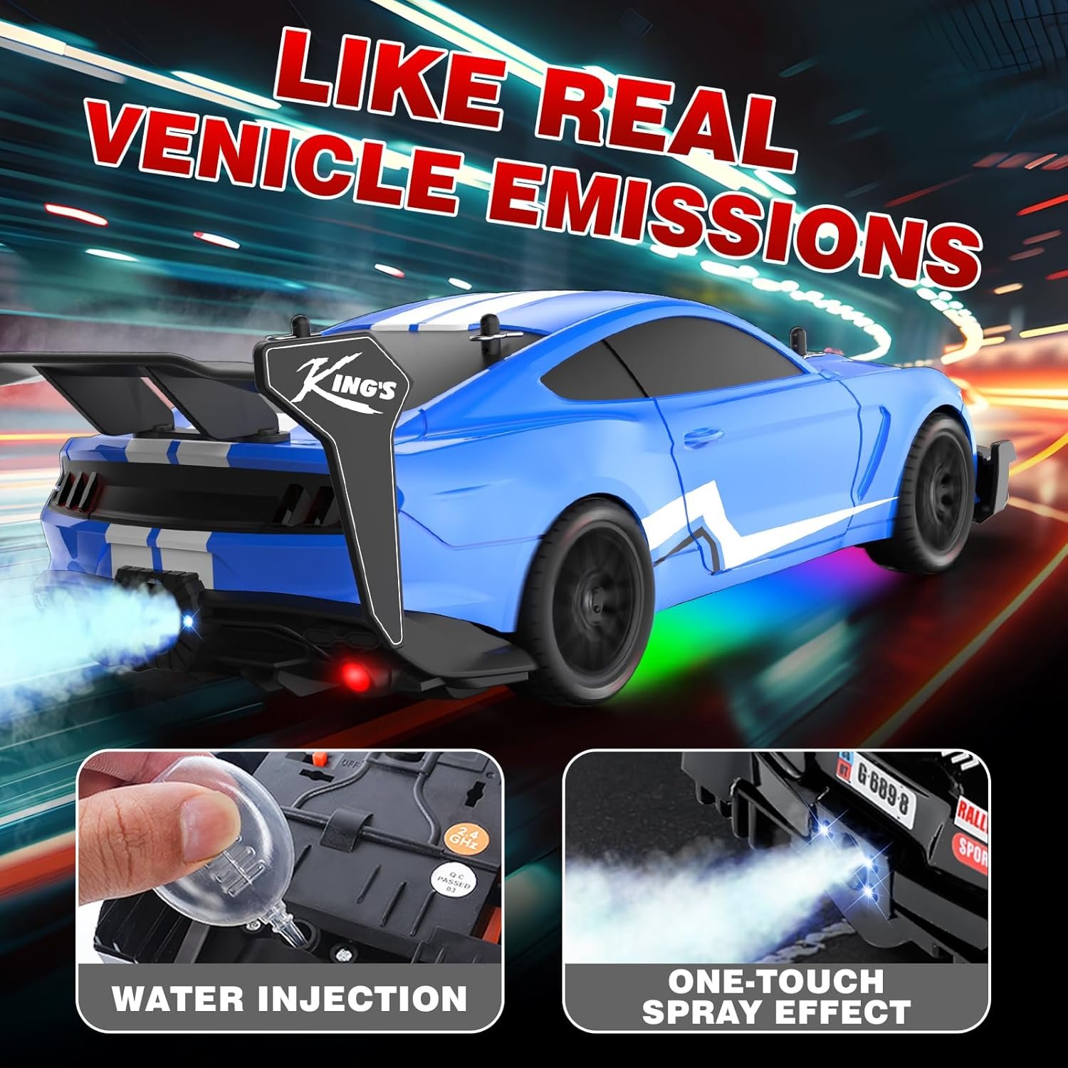 Машинка для дрифта от HB Toys масштаба 1:16. Помимо пульта ДУ в наборе поставляются запасные колеса, ключ для смены колес, зарядное устройство и аккумулятор. Из выхлопной трубы можно активировать спрей-пар, а фары светятся во время движения. Цвет кузова - серый с синим.