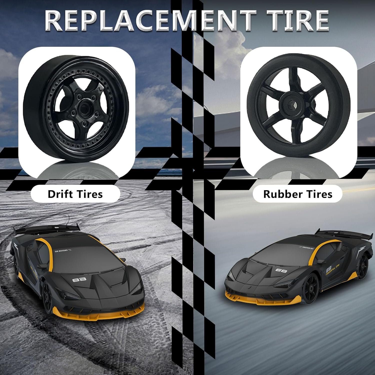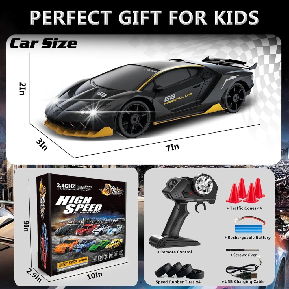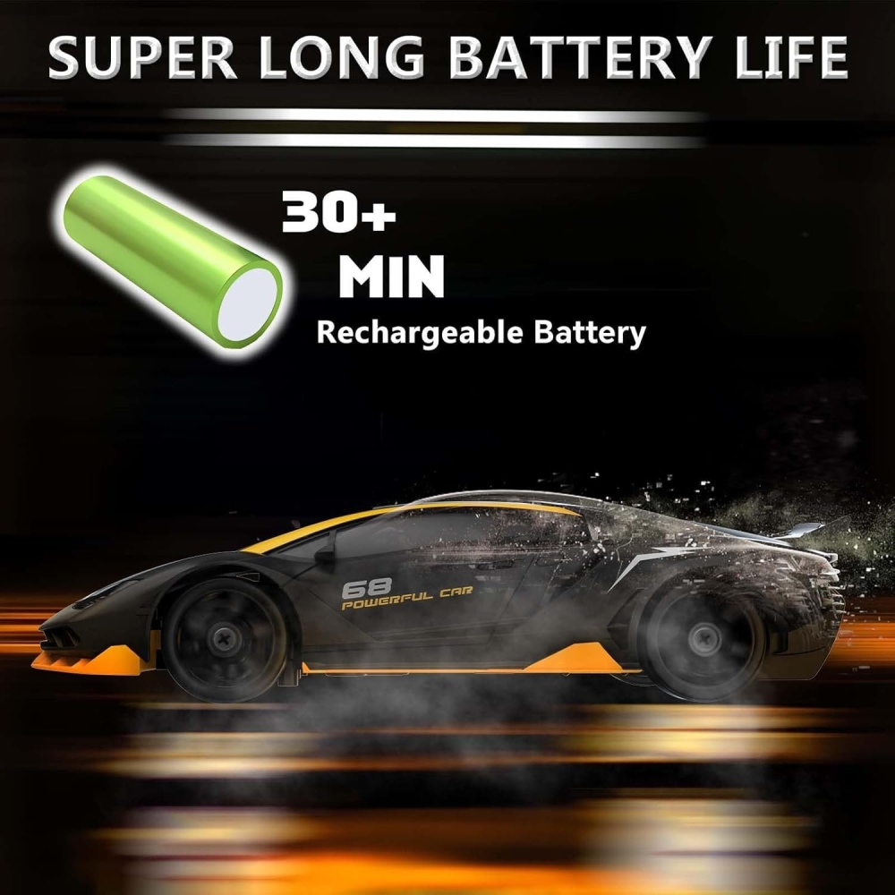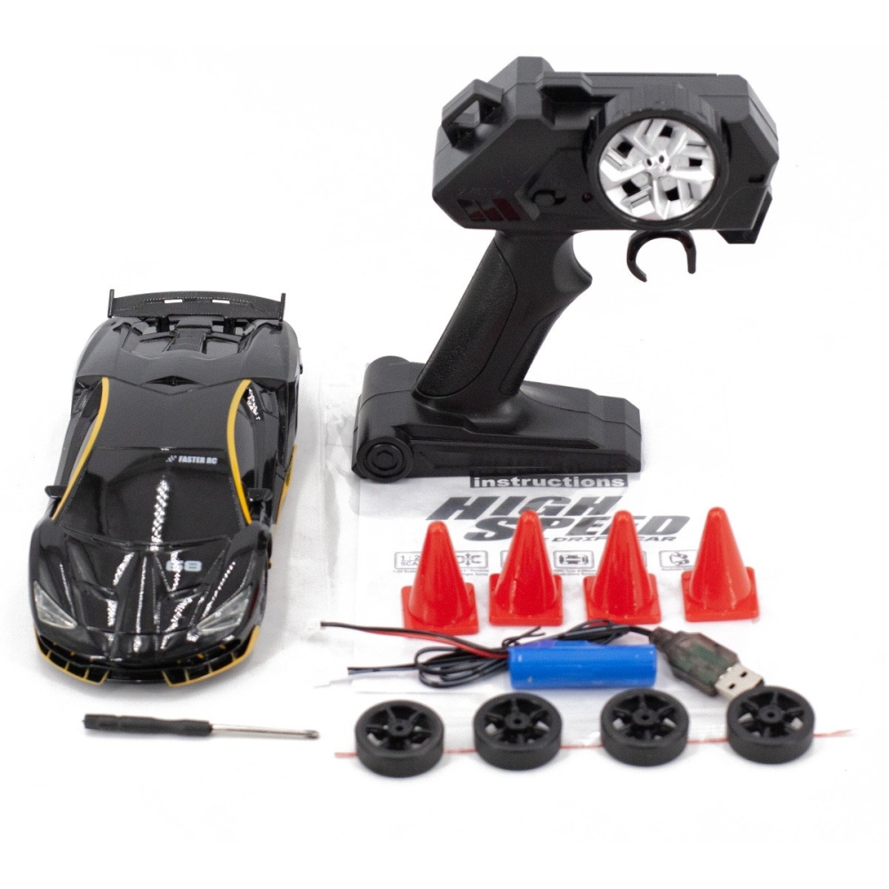 Машинка управляется при помощи пульта ДУ, работающего на частоте 2,4 ГГц. В наборе также поставляются комплект запасных колес, дорожные конусы, зарядное устройство и аккумулятор. Во время движения у машинки светятся фары.