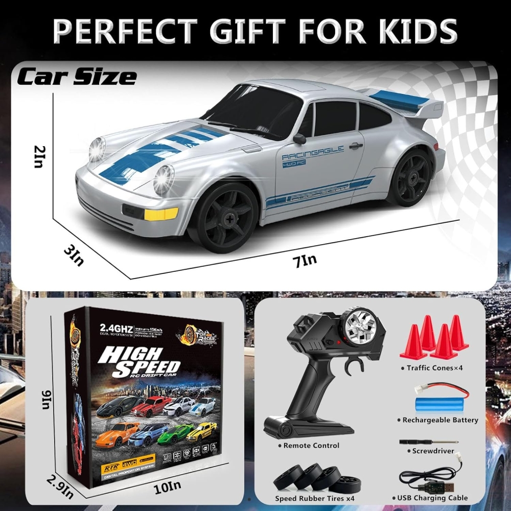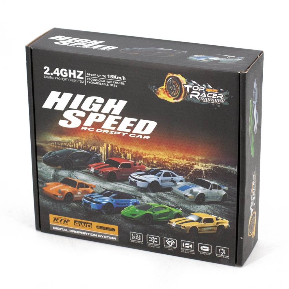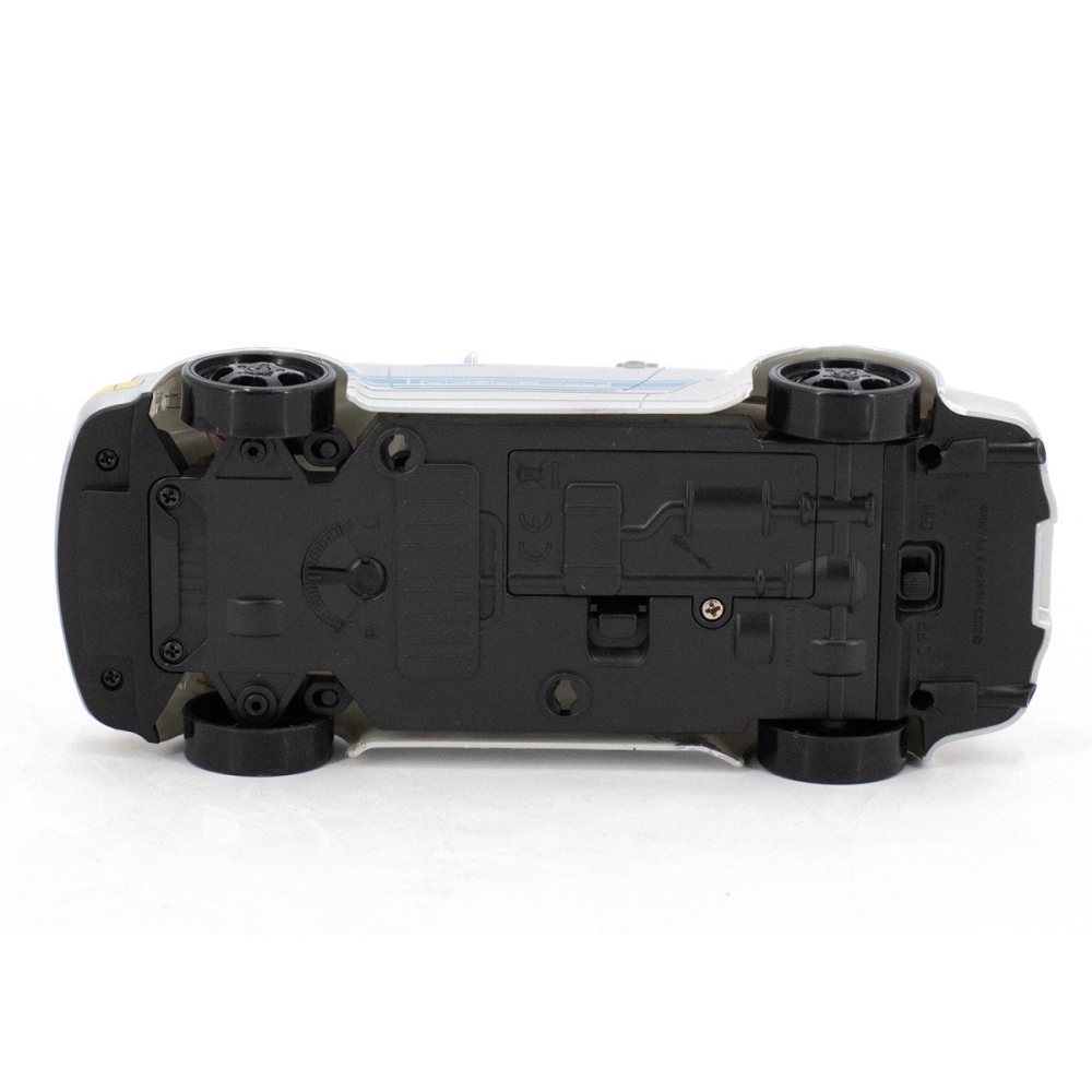 Машинка управляется при помощи пульта ДУ, работающего на частоте 2,4 ГГц. В наборе также поставляются комплект запасных колес, дорожные конусы, зарядное устройство и аккумулятор. Во время движения у машинки светятся фары.