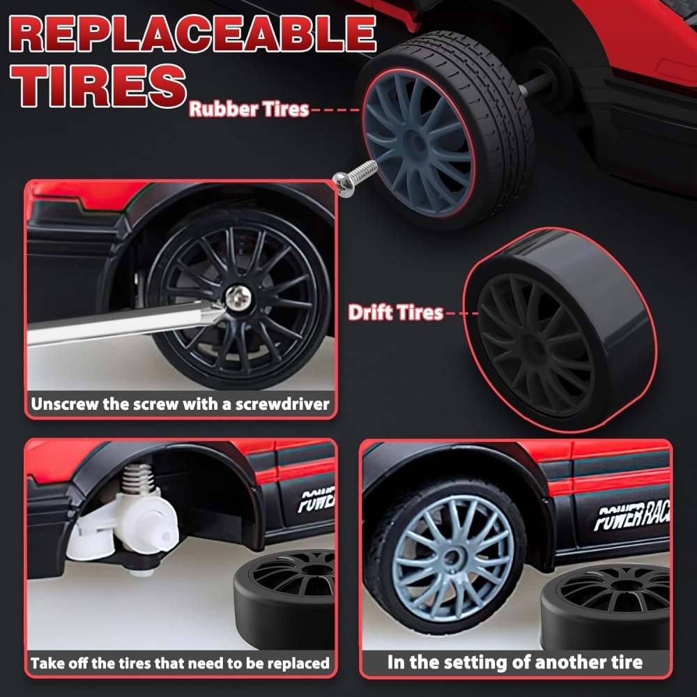 Мини дрифт машинка отлично подойдет для дрифта как по дому, так и на улице по ровной поверхности. Имеет задний привод и мощный коллекторный мотор, который позволит заходить в повороты даже новичкам без опыта в дрифте. Масштаб 1:24 позволят лихо проезжать между любыми препятствиями даже в домашних условиях. Машинка выполнена по лицензии компании Toyota, поэтому детализация модели максимальная, в точности повторяющая легендарный оригинал. Передние фары оснащены светодиодными огнями, которые загораются при включении машины, придавая большей реалистичности. В комплекте идет 6 оранжевых конусов, поэтому вы самостоятельно сможете выстраивать маршрут дрифта. Также идет сменный комплект колес с резиновыми покрышками и протектором.