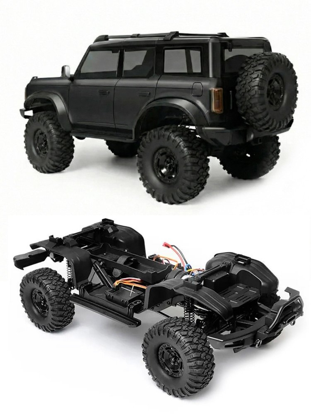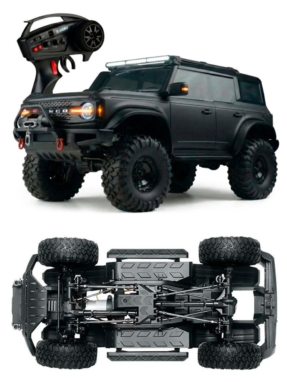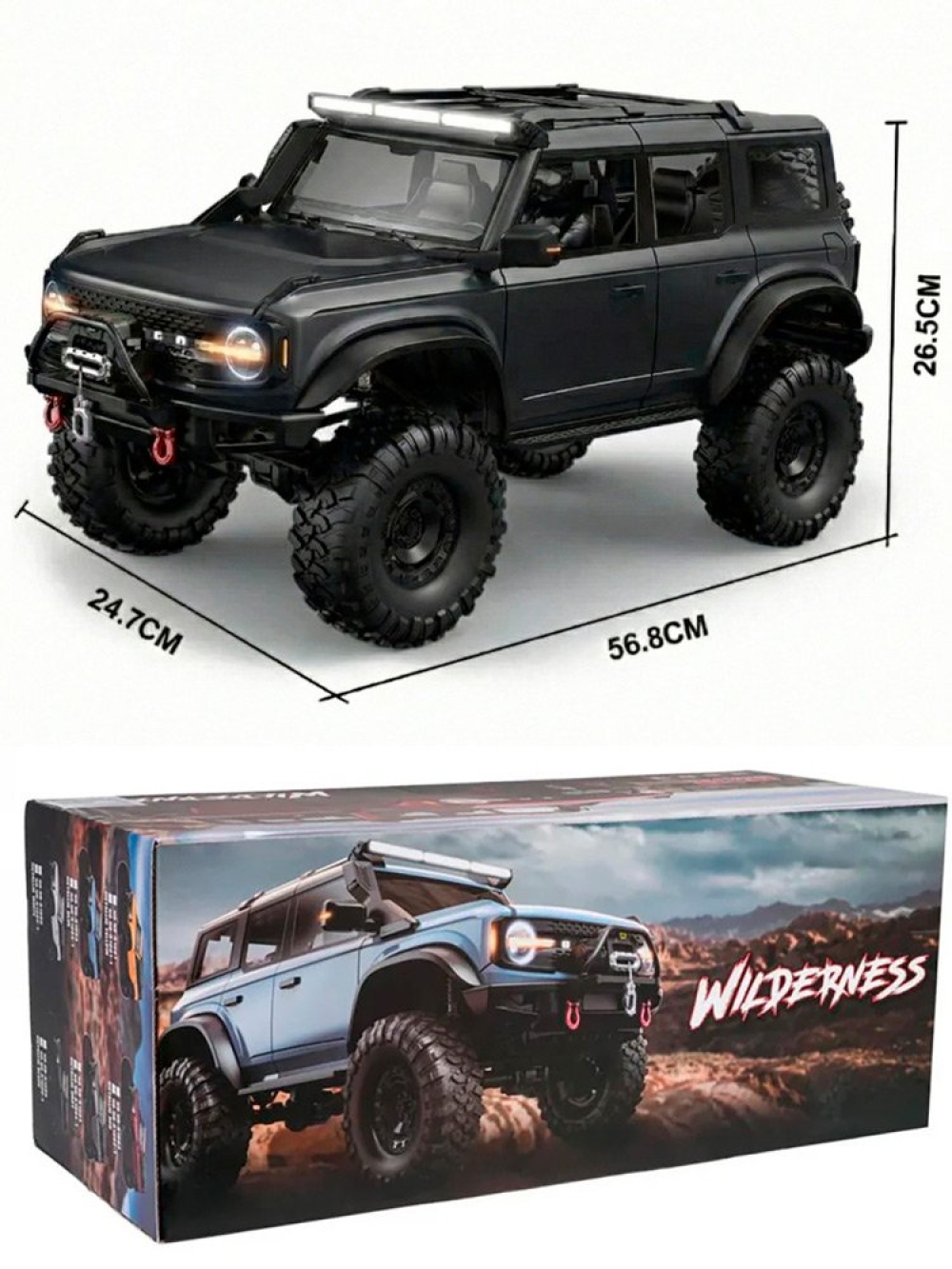 Большой реалистичный внедорожник Bronco. Имеет полный привод и мягкие резиновые колеса. Модель имеет оригинальный раскрашенный кузов, на крыше которого расположен дополнительный багажник. Джип предназначен для сурового бездорожья - ямы, гравий и камни не помеха. Набор скорости и поворот колес пропорциональны управлению с пульта. Имеет мощный электромотор, что делает его более управляемым и маневренным. Подвеска имеет пружинные амортизаторы.