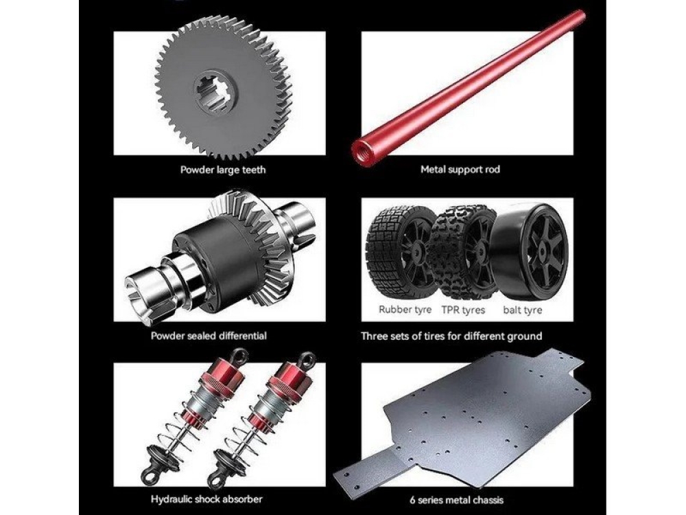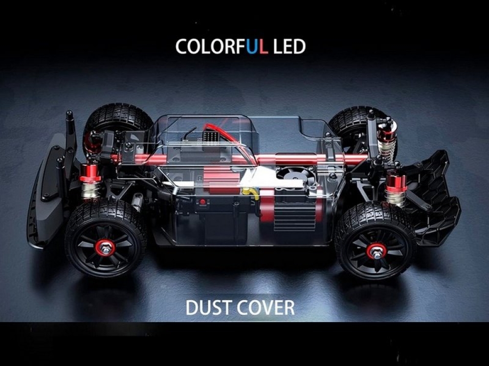 Машинка способна развивать скорость 43 км/ и более за счет мощного бесколлекторного мотора, который оснащен не только радиатором охлаждения, но и кулером. Теперь вы можете кататься на полной скорости без остановок, риск перегрева двигателя теперь будет минимальным. Полноприводная трансмиссия с металлическими дифференциалами также способна выдержать экстремальные нагрузки. В заводском исполнении на модель уже установлены металлические пружинные амортизаторы, плотность которых вы можете регулировать с помощью специального масла для амортизаторов различной вязкости.