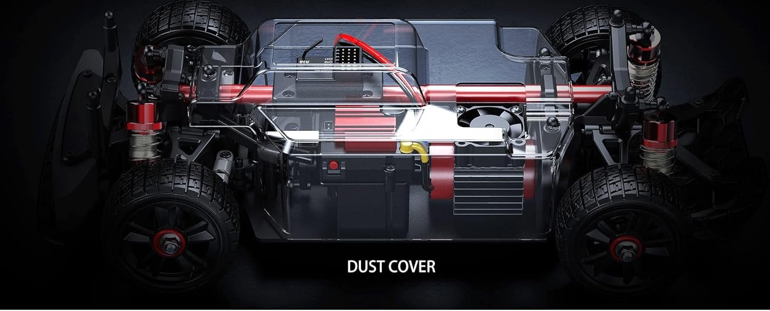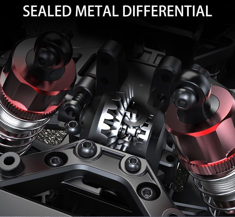 Машинка способна развивать скорость 55 км/ и более за счет мощного бесколлекторного мотора, который оснащен не только радиатором охлаждения, но и кулером. Теперь вы можете кататься на полной скорости без остановок, риск перегрева двигателя теперь будет минимальным. Полноприводная трансмиссия с металлическими дифференциалами также способна выдержать экстремальные нагрузки. В заводском исполнении на модель уже установлены металлические пружинные амортизаторы, плотность которых вы можете регулировать с помощью специального масла для амортизаторов различной вязкости.