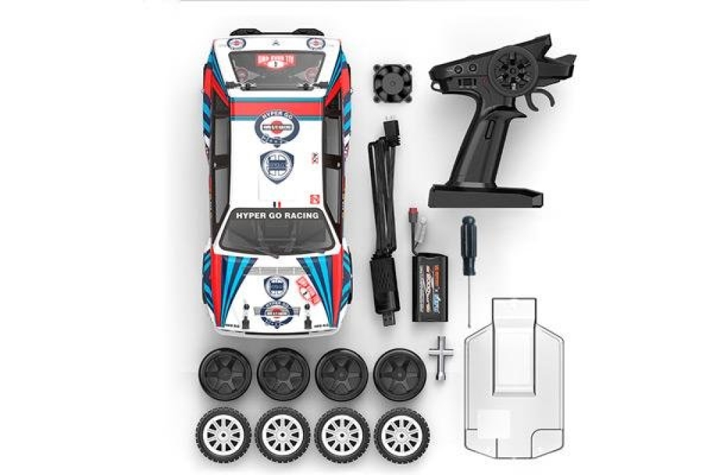 полностью собранная модель, с окрашенным кузовом и установленной влагозащищенной электроникой 2.4G, аккумулятор - 2000 mAh Li-Ion 7.4V, зарядное устройство для аккумулятора, работающее от сети 220v., пульт управления, 3 комплекта колес, ключ и отвертка, держатель для смартфона, инструкция