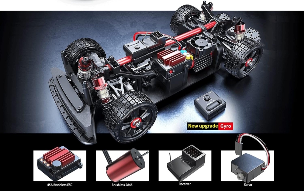 Машинка способна развивать скорость 55 км/ и более за счет мощного бесколлекторного мотора, который оснащен не только радиатором охлаждения, но и кулером. Теперь вы можете кататься на полной скорости без остановок, риск перегрева двигателя теперь будет минимальным. Полноприводная трансмиссия с металлическими дифференциалами также способна выдержать экстремальные нагрузки. В заводском исполнении на модель уже установлены металлические пружинные амортизаторы, плотность которых вы можете регулировать с помощью специального масла для амортизаторов различной вязкости.