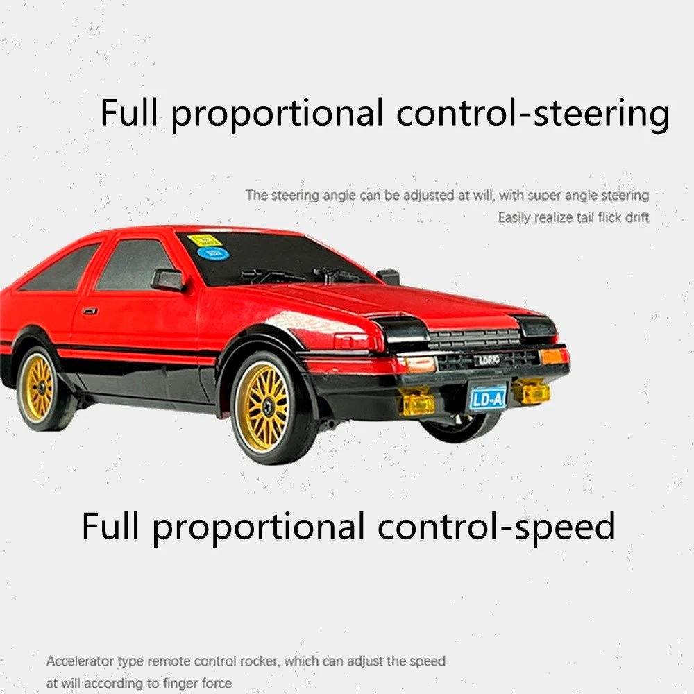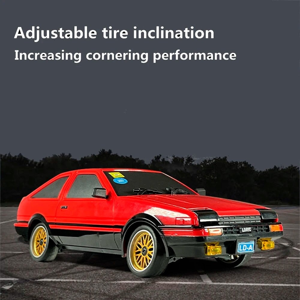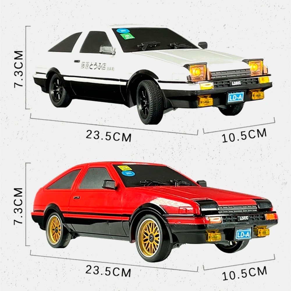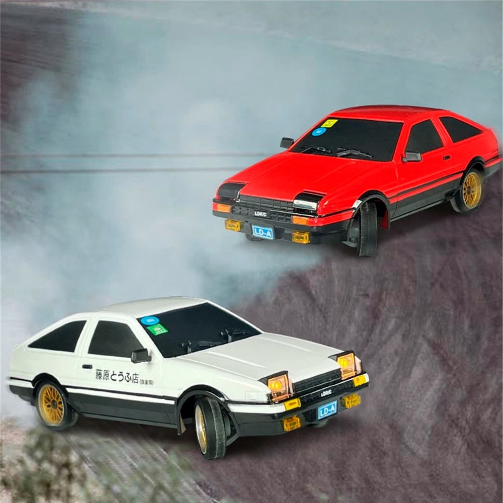 Оригинальная модель AE86 — это Corolla запущенная в производство в 1983 году. Модель выполнена в масштабе 1:18, а внешний вид выполнен в соответствии с фактическими пропорциями. Применяется многорычажная конструкция подвески, которую можно регулировать, передние и задние колеса можно наклонять внутрь и наружу, выдвигающимися фарами (как у настоящего авто) можно управлять с помощью пульта дистанционного управления. Машинка имеет полностью пропорциональное управление как ускорения, так и поворота колес. Плата аккумуляторной батареи имеет защиту от перезаряда и переразряда, защиту от низкого напряжения. Оснащен литиевой батареей 7,4 В, 500 мА, USB-кабелем для зарядки, двигателем 180 класса. Встроенный гироскоп позволяет машине удерживать заданную траекторию, помогая вам получать максимум азарта от динамичных заездов!