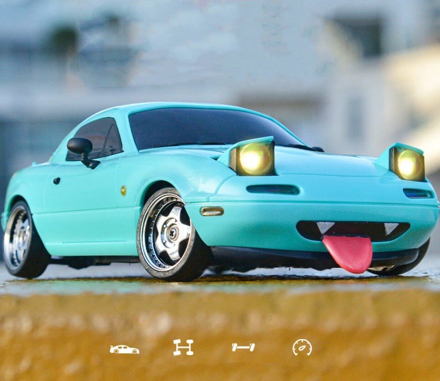 Модель для дрифта на пульте управления - классический кузов Mazda MX-5. Имеет высокую детализацию. В комплекте 2 комплекта колес для разных типов поверхностей. Задний привод 2WD с мощным коллекторным мотором. Поднимающиеся фары со светодиодными огнями. Встроенный гироскоп для курсовой устойчивости во время дрифт заездов.