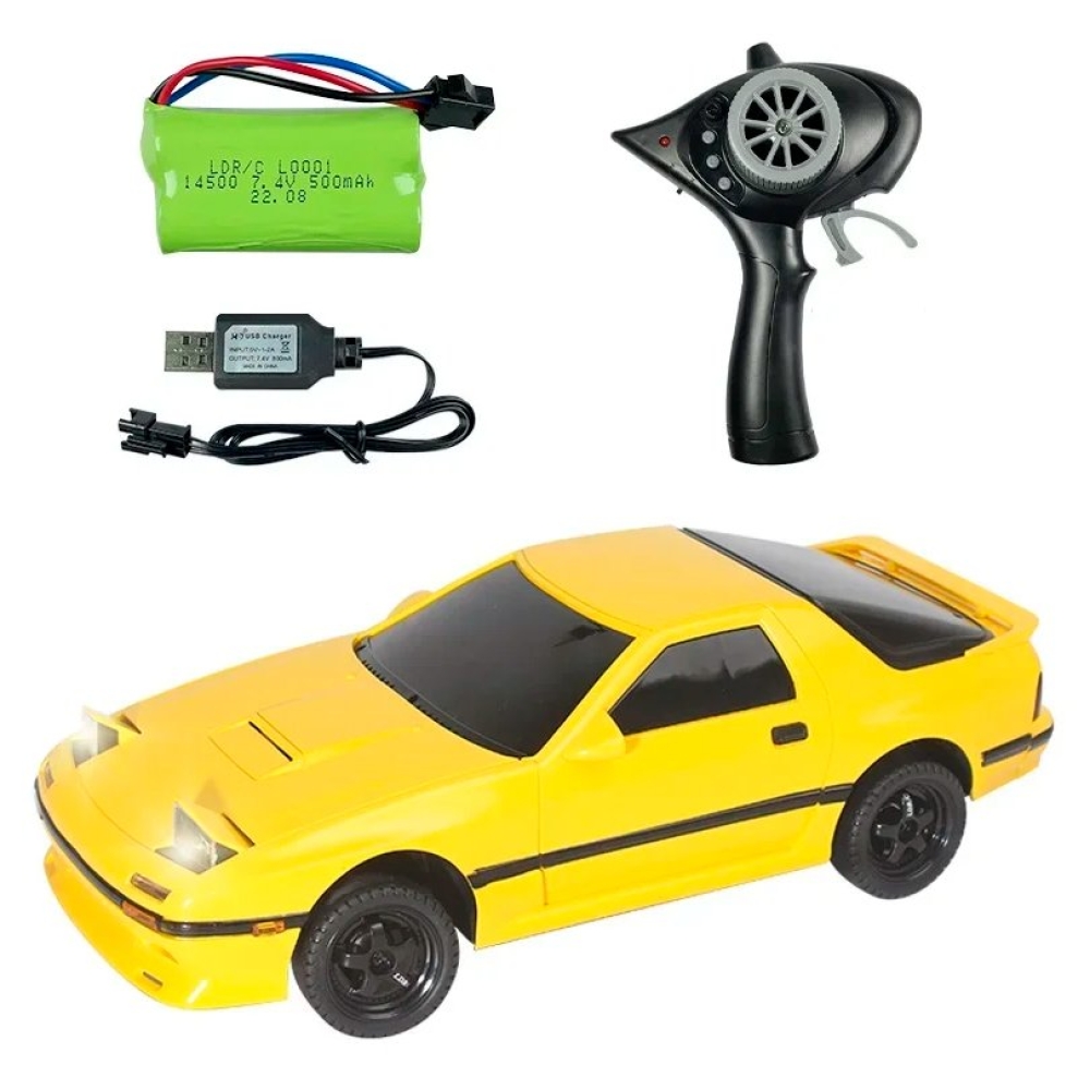 Оригинальная модель RX-7. Модель выполнена в масштабе 1:18, а внешний вид выполнен в соответствии с фактическими пропорциями. Применяется многорычажная конструкция подвески, которую можно регулировать, передние и задние колеса можно наклонять внутрь и наружу, выдвигающимися фарами (как у настоящего авто) можно управлять с помощью пульта дистанционного управления. Машинка имеет полностью пропорциональное управление как ускорения, так и поворота колес. Плата аккумуляторной батареи имеет защиту от перезаряда и переразряда, защиту от низкого напряжения. Оснащен литиевой батареей 7,4 В, 500 мА, USB-кабелем для зарядки, двигателем 150 класса.