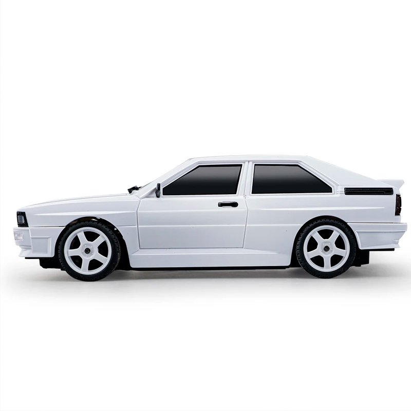 Модель для дрифта на пульте управления - классический кузов Audi Quattro S1. Имеет высокую детализацию. В комплекте 2 комплекта колес для разных типов поверхностей. Полный привод 4WD с мощным коллекторным мотором. Включаются фары со светодиодными огнями.