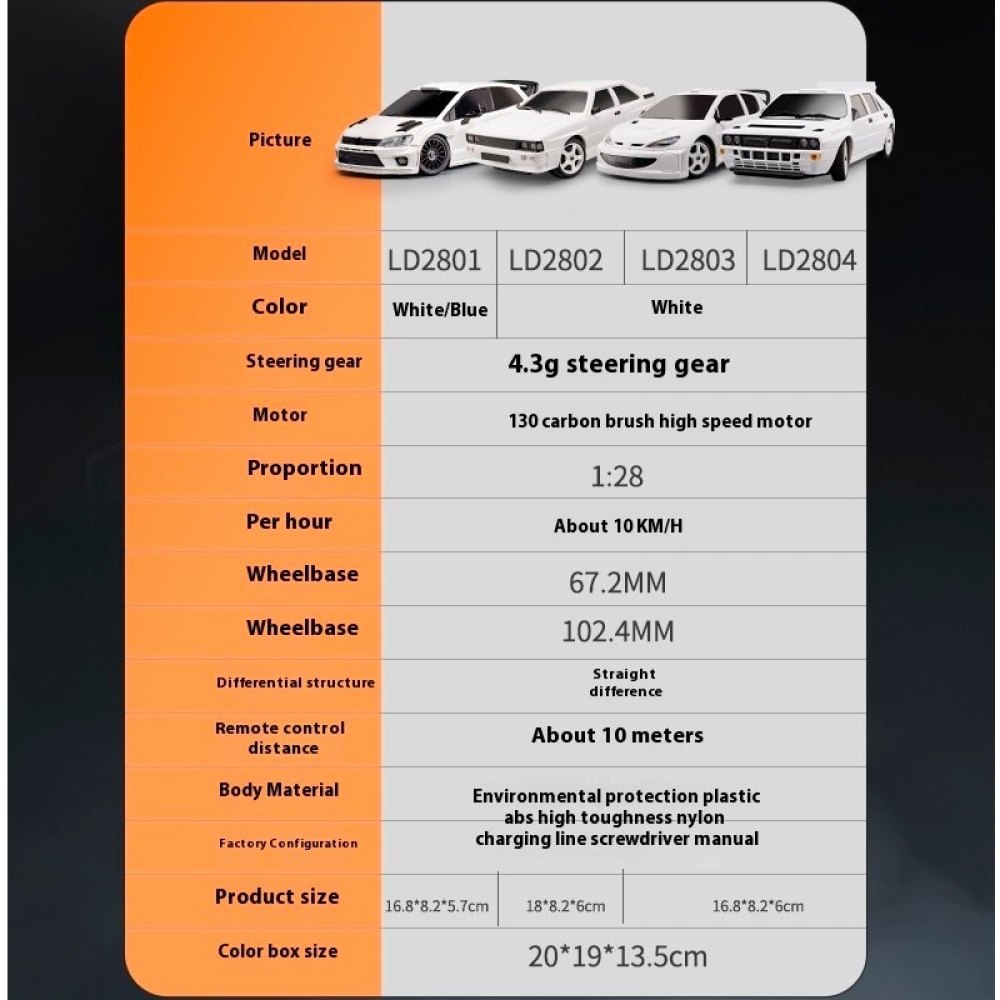 Оригинальная модель Peugeot 206 WRC. Модель выполнена в масштабе 1:28, а внешний вид выполнен в соответствии с фактическими пропорциями. Машинка имеет полностью пропорциональное управление как ускорения, так и поворота колес. Плата аккумуляторной батареи имеет защиту от перезаряда и переразряда, защиту от низкого напряжения. Оснащен литиевой батареей 3.7 В, 500 мА, USB-кабелем для зарядки, двигателем 130 класса.