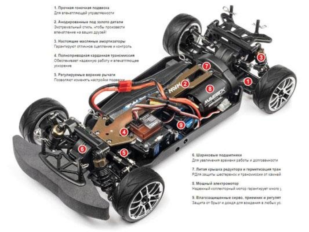 - LiPo-совместимый контроллер скорости (инструкции по переключению между режимами NiMH и LiPo см. В руководстве) с защитным отключением LiPo