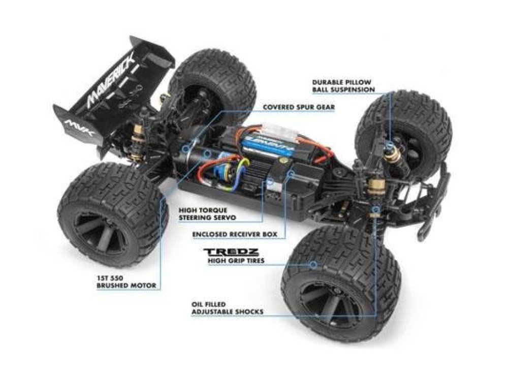 Премиум серия машин трагги от компании Maverick предлагает высокопрочное шасси с большим количеством металлических деталей, яркий и интересный дизайн, а также лучшую в данном сегменте электронику. Каждый элемент модели идеально продуман инженерами компании, качество сборки и стыковки деталей и настройки шестерней на высоком уровне. Это позволяет существенно увеличить как срок службы машинки, так и меньшее времени тратить на постоянное обслуживание и ремонт. Фирменный коллекторный мотор стыкуется с трансмиссией с помощью металлической пластины-фиксатора и нескольких прочных болтов. Низкий центр тяжести и подготовленная резина позволит вам профессионально входить в крутые повороты на самой высокой скорости. Точная настройка стыковки ведомых и ведущих шестерней в разы уменьшает лишний износ данных деталей, более точное управление и снижение уровня шума в виде металлического гула. Трагги отлично подойдет для заездов на разных типах поверхности - ровный асфальт, песок, гравий. а также трофи рейды по грязи и лужам. Привод 4 x 4 с металлическими дифференциалами увеличивают проходимость модели и ресурс работы.