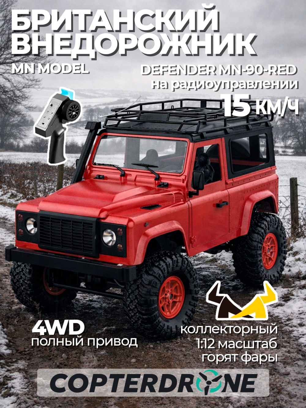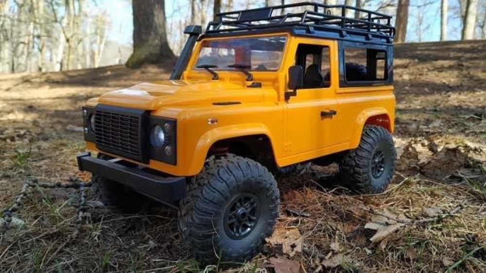 Кузов модели в точности повторяет оригинальный британский внедорожник Defender D90 для заездов по суровому бездорожью - радиаторная решетка и колесные раки, воздухозаборник, выведенный наружу и накрышный багажник, а также фары и даже щетки дворников. Предназначается для трофи заездов по полному бездорожью или для сафари. Получил популярность за счет своей высокой надежности и долговечности, а также отличной проходимости. Фары джипа светятся, поэтому можно кататься в ночное время. В кабине с высокой детализацией также выполнен салон с сиденьями и приборной панелью. Модель построена на популярном шасси, на котором выпускаются хорошо знакомые грузовики Урал и Газ 66. Это стальное рамное шасси. Подвеска имеет передний и задний мост в которых расположены редукторы, на каждое колесо идет пружинный амортизатор. Полный привод осуществляется за счет карданной системы и 2-х редукторов. Увеличенный клиренс поможет преодолеть большие валуны, бревна или грязевой затор. Машинку можно использовать как дома, так и на улице в сухую погоду. Модель полностью ремонтопригодна, можно легко заменить любую деталь подвески, а также сервопривод или мотор.