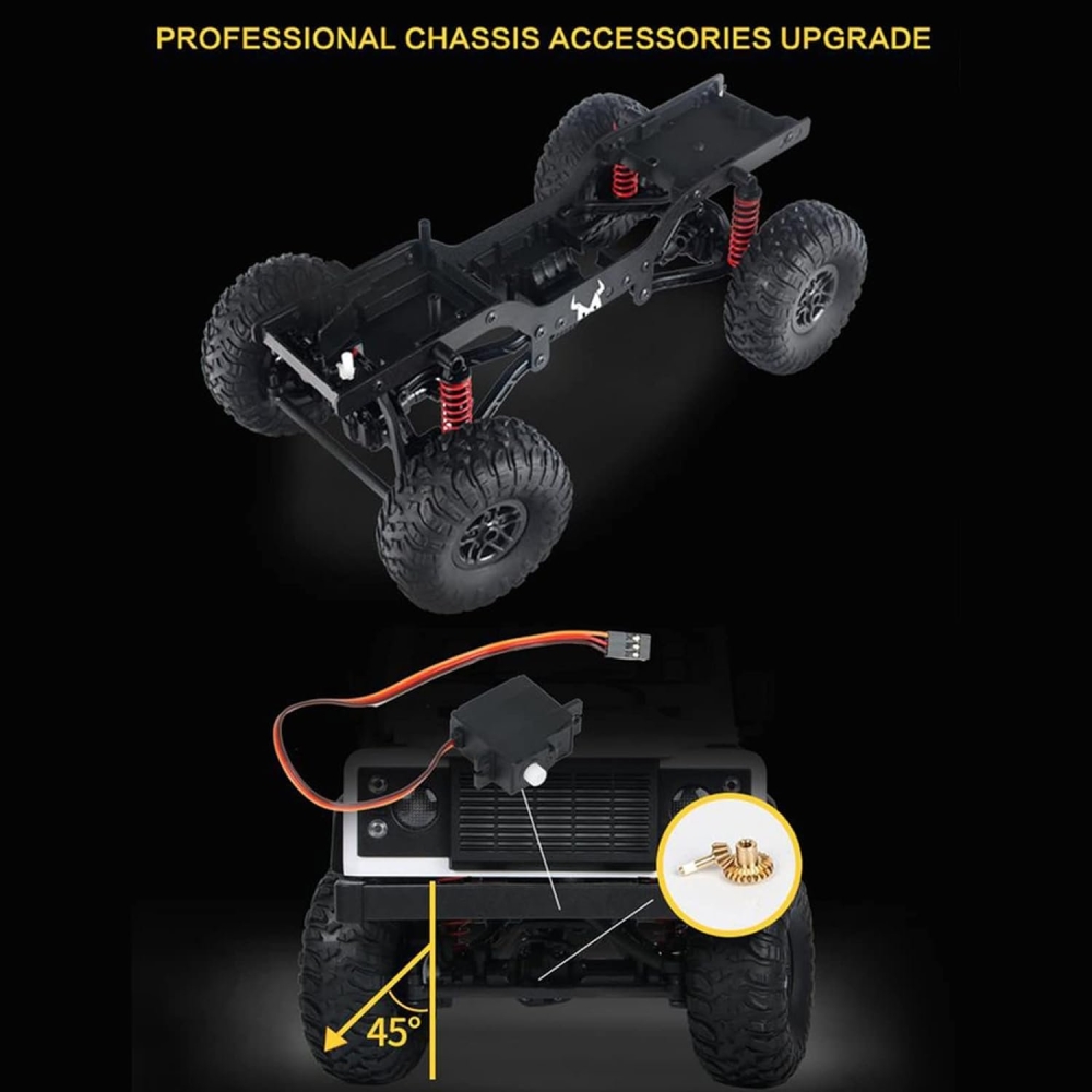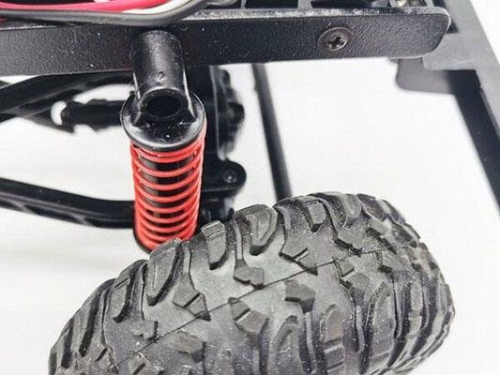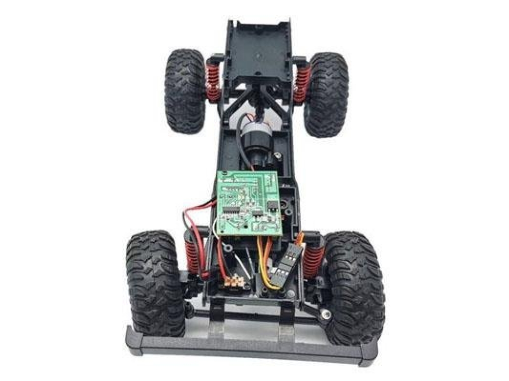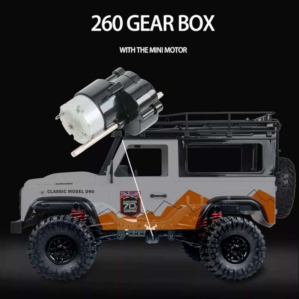 Кузов модели в точности повторяет оригинальный внедорожник Defender D90 для заездов по суровому бездорожью - радиаторная решетка и колесные раки, воздухозаборник и накрышный багажник, а также фары. Цвет кузова - фирменный голубой, для трофи заездов по полному бездорожью. Фары светятся, поэтому можно кататься в ночное время. В кабине с высокой детализацией также выполнен салон с сиденьями и приборной панелью. Модель построена на популярном шасси, на котором выпускаются хорошо знакомые грузовики Урал и Газ 66. Это стальное рамное шасси. Подвеска имеет передний и задний мост в которых расположены редукторы, на каждое колесо идет пружинный амортизатор. Полный привод осуществляется за счет карданной системы. Увеличенный клиренс поможет преодолеть большие валуны, бревна или грязевой затор. Машинку можно использовать как дома, так и на улице в сухую погоду. Модель полностью ремонтопригодна, можно легко заменить любую деталь подвески, а также сервопривод или мотор.