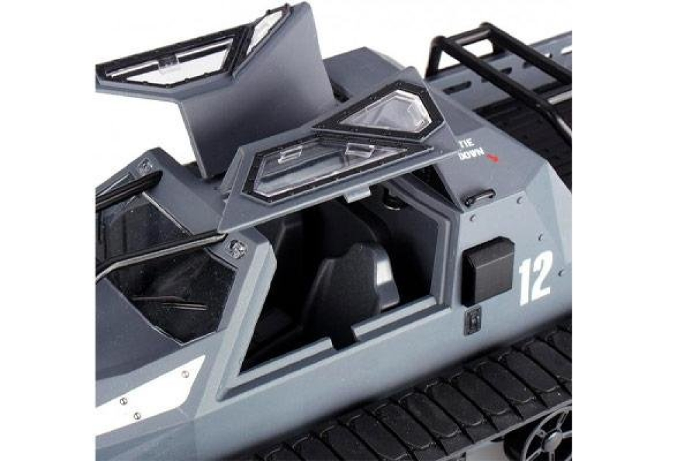 Этот гусеничный вездеход амфибия способен преодолевать пересечённую местность там, где не проедет не один полноприводный автомобиль. Оснащен амортизаторами и поэтому вездеход плавно преодолевает любого рода насыпи из камней, палок и так далее. Оснащен усиленной рамой, что придает прочности всей конструкции, кабина выполнена в очень высокой детализации, вы можете открыть двери и заглянуть в кабину. Несмотря на то что данная машинка игрушка является практически танком, она имеет достаточно высокую скорость и разгоняется до 12 км/ч. На вездеход установлен емкий аккумулятор на 1200 mah, а время игры составят более 20 минут. Пульт управления 2.4 ГГц имеет дальность управления машины до 100 м. В зависимости от типа дорожной поверхности Вы можете регулировать натяжение гусениц для большей проходимости, максимальный угол подъема составляет 30 градусов.